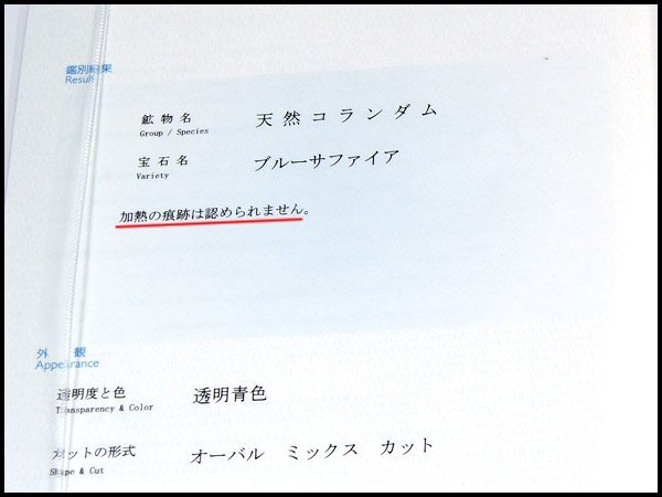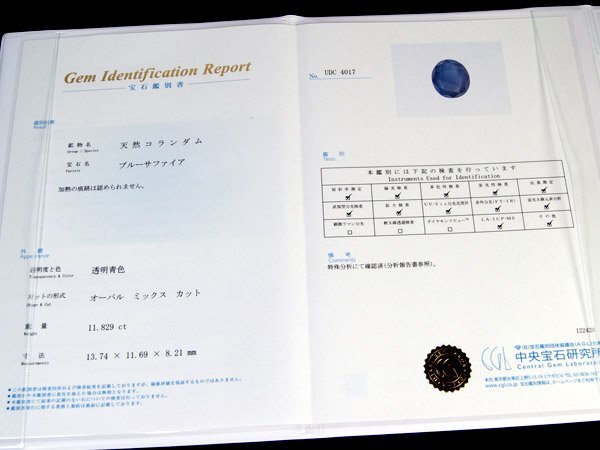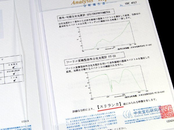 中央宝石研究所発行の宝石鑑別書及び非加熱分析表付属(産地記載有り)