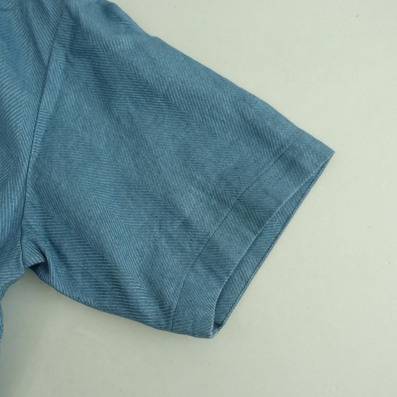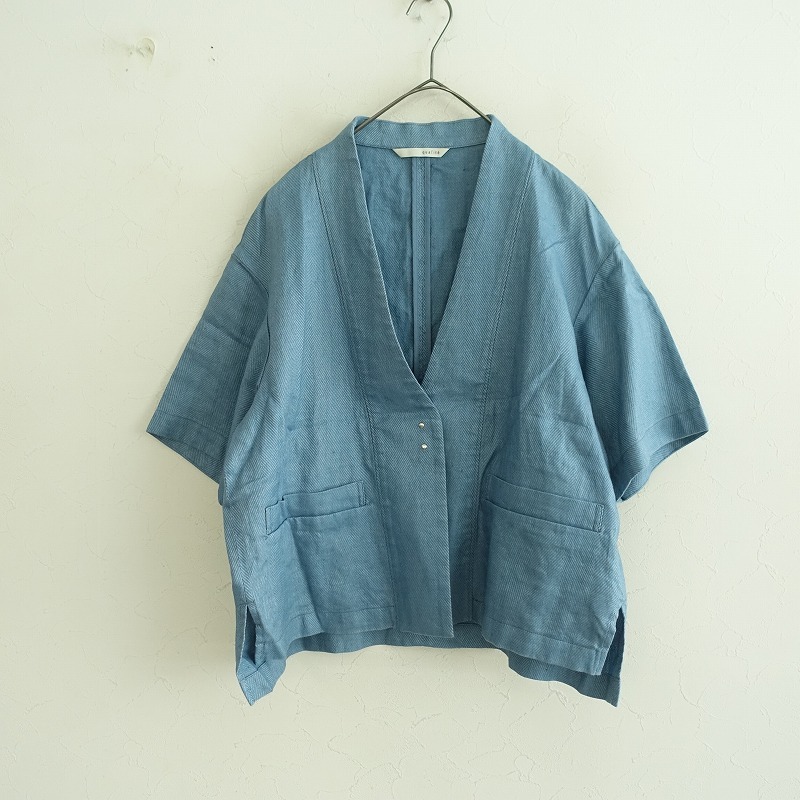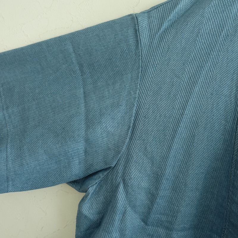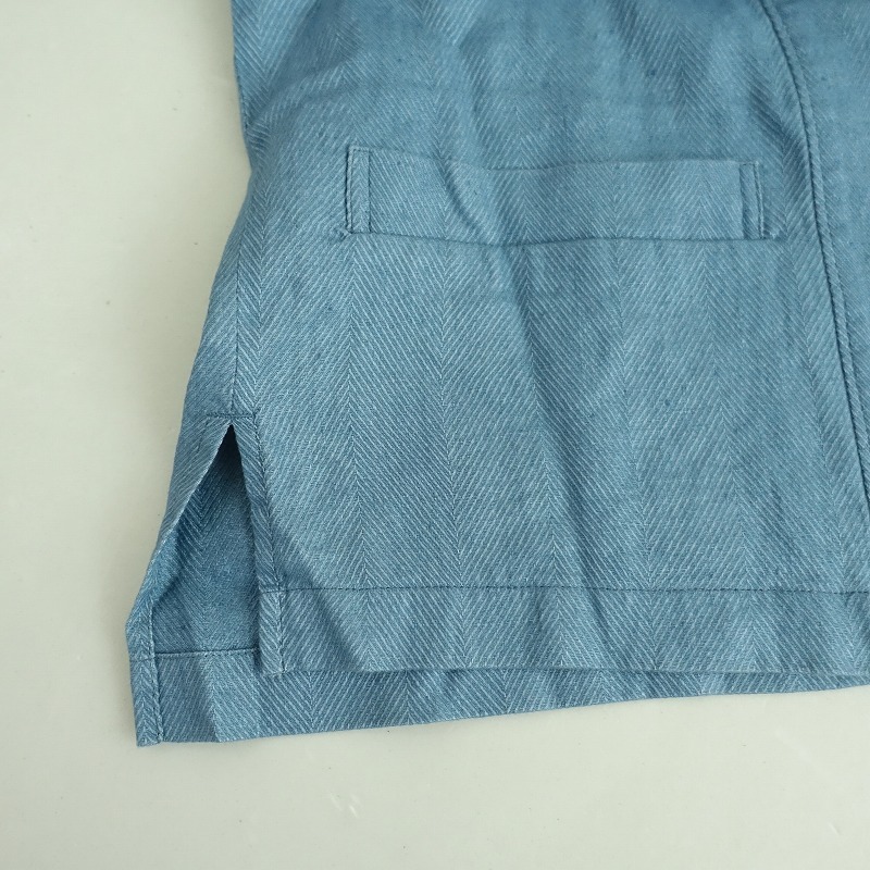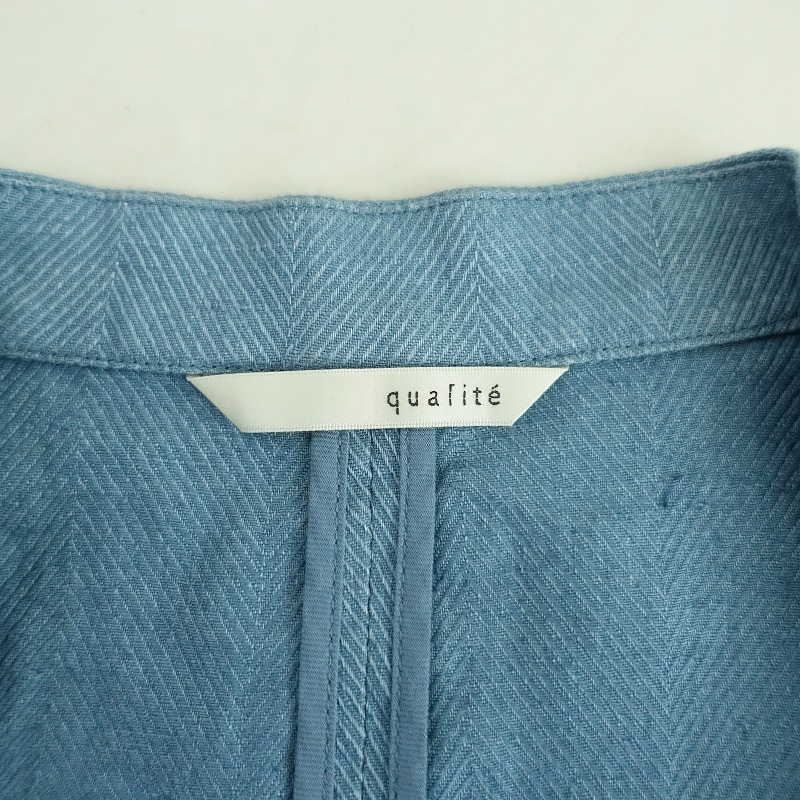 qualiteのリネンノーカラージャケットです。カラーはブルーで、ヘリンボーン織りのリネン地で仕立てられています。フロントはフック開閉で、裾サイドにスリット入り、両サイドにポケット付きです。定価(メーカー希望小売価格) 28,600円の商品です。 |