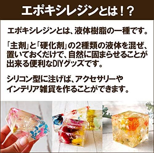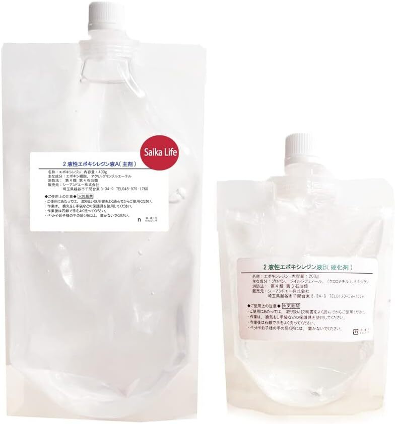 アクセサリー製作やインテリア雑貨製作に人気のエポキシレジン ハンドメイドグッズとして人気のエポキシ樹脂です。レジンアート作品・固まるハーバリウム・リバーテーブル・オルゴナイト・ピアス・ネックレス・ペンダントなどのアクセサリーやインテリア雑貨が簡単に作れます。 ■商品名: 2液性エポキシレジン液(主剤 硬化剤),説明書付き 原料生産国:中国/ 最終加工:日本 A液(主液):エポキシ樹脂、アクリルグリシジルエーテル B液(硬化剤):プロパン、ジイルジフェノール、(クロロメチル)オキシラン ■硬化時間:20~25℃の温度で24~36時間で硬化。制作物が小さい場合や厚みが薄い場合は、硬化までに2~3日程度かかる場合があります。 ■使用期限:約半年      2液性エポキシ樹脂(レジン)のおすすめポイント     ■透明度の高いエポキシレジン液です。 クリアな仕上がりの作品が出来ます。     ■2液で化学反応を起こして、固めるレジン液ですので、特別な機械はいりません。     ■作業時間を長く取ることの出来るレジン液です。 リバーテーブルなどの家具などの大きな作品にも使えます。     ■液体・粉末顔料との相性も抜群です。ムラ無くよく混ざります。          ■注ぎやすいパウチでお届けします。しっかり保存もできます。     ■経年による変化が少ないタイプですので、黄変しづらいです。 ※但し、直射日光などに当たると黄ばみやすくなります。     ■レジンを使ったこと無い方でも簡単につくれる説明書をお付けします。