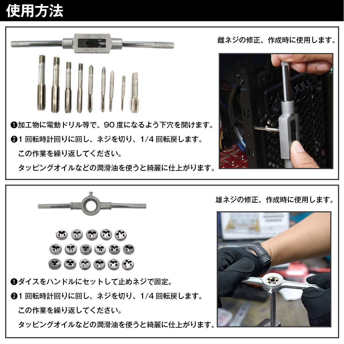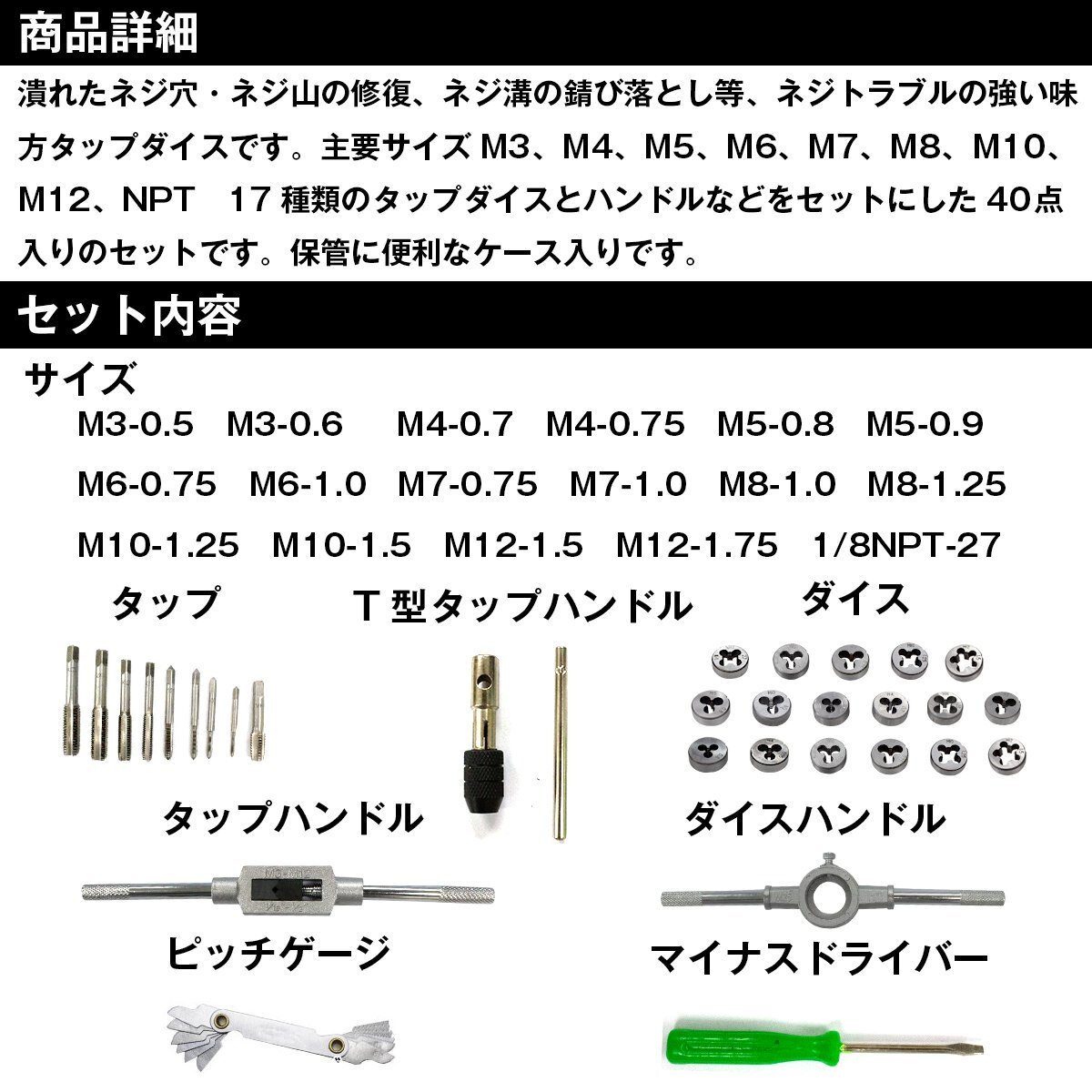 商 品 説 明ネジ穴やボルトの補修が出来る40pcsタップ&ダイスセット!