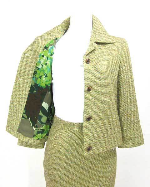 ラフに着て頂けるニットツィードのスカートスーツ。ジャケットの裏地はグリーン系のプリント柄で脱いだ時に見えるちら見えもおしゃれです。お袖は少し短めデザインで、インナーを見せた着かたで楽しむことができます。お顔周りが華やかになるお色で、普段にも使えるスーツです。 |
