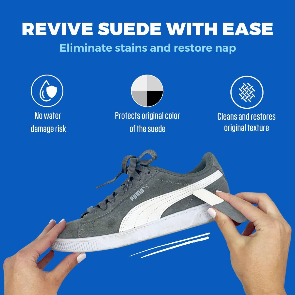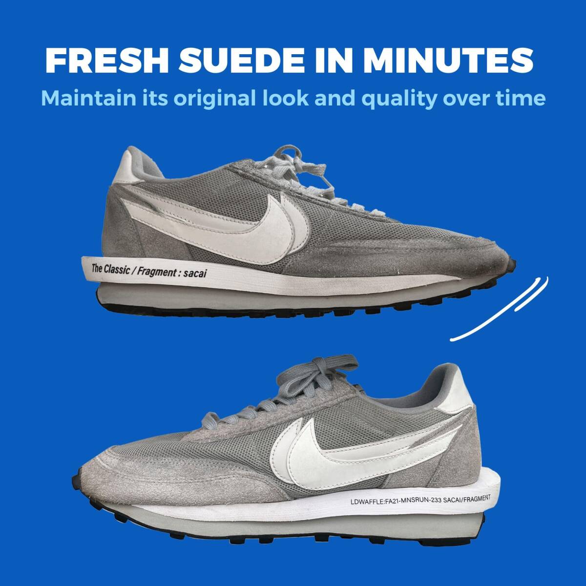 スエードを簡単に復活させる: スエード靴用の優しく効果的なドライクリーニングソリューションです。傷や汚れを取り除き、ナップを復元し、水によるダメージのリスクなしでスエードを蘇らせます。スエード靴の外観と品質を長期間保つために最適です。