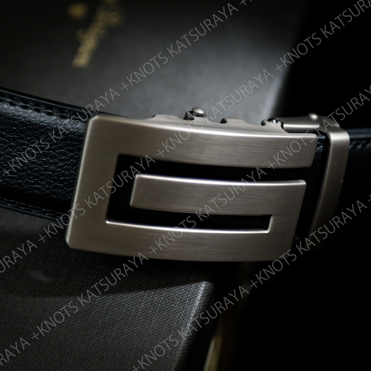 デニムにチノパンに、重厚で個性的なバックルが魅力のオートロック方式本革ベルトです。35段階、約21㎝の可動範囲でラチェット式オートロック機構が働き、装着は差し込むだけ、取り外しや食後の調整はレバーを倒して行います。