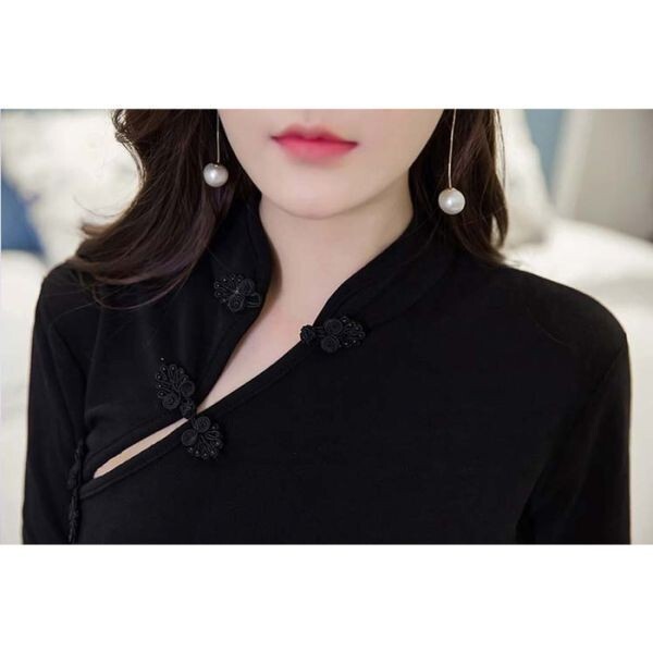 チャイナドレス ショート丈 ハイネック 伸縮 ロングスリーブ 前開き Sライン肩紐 コットン レディース ブラック L