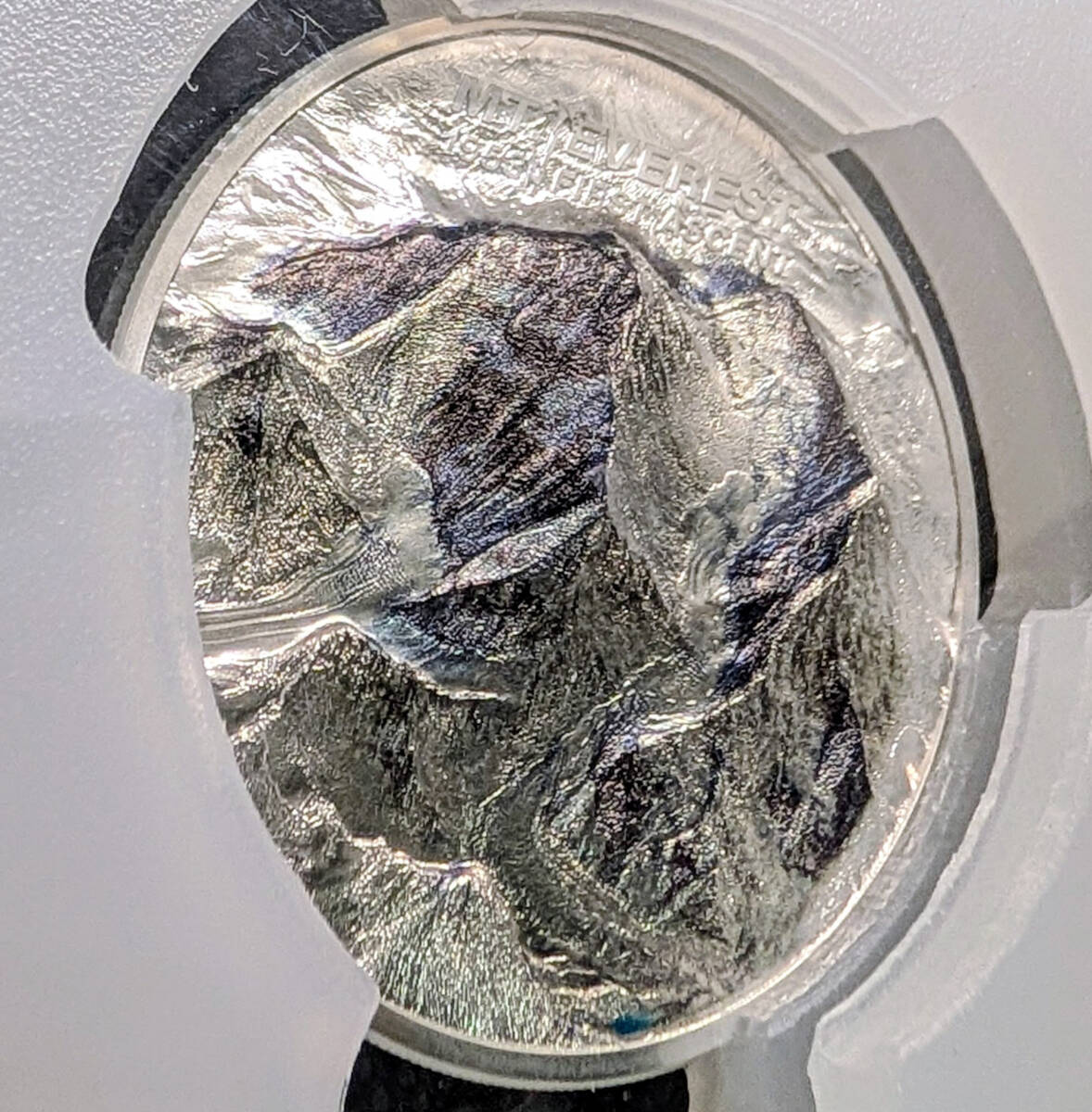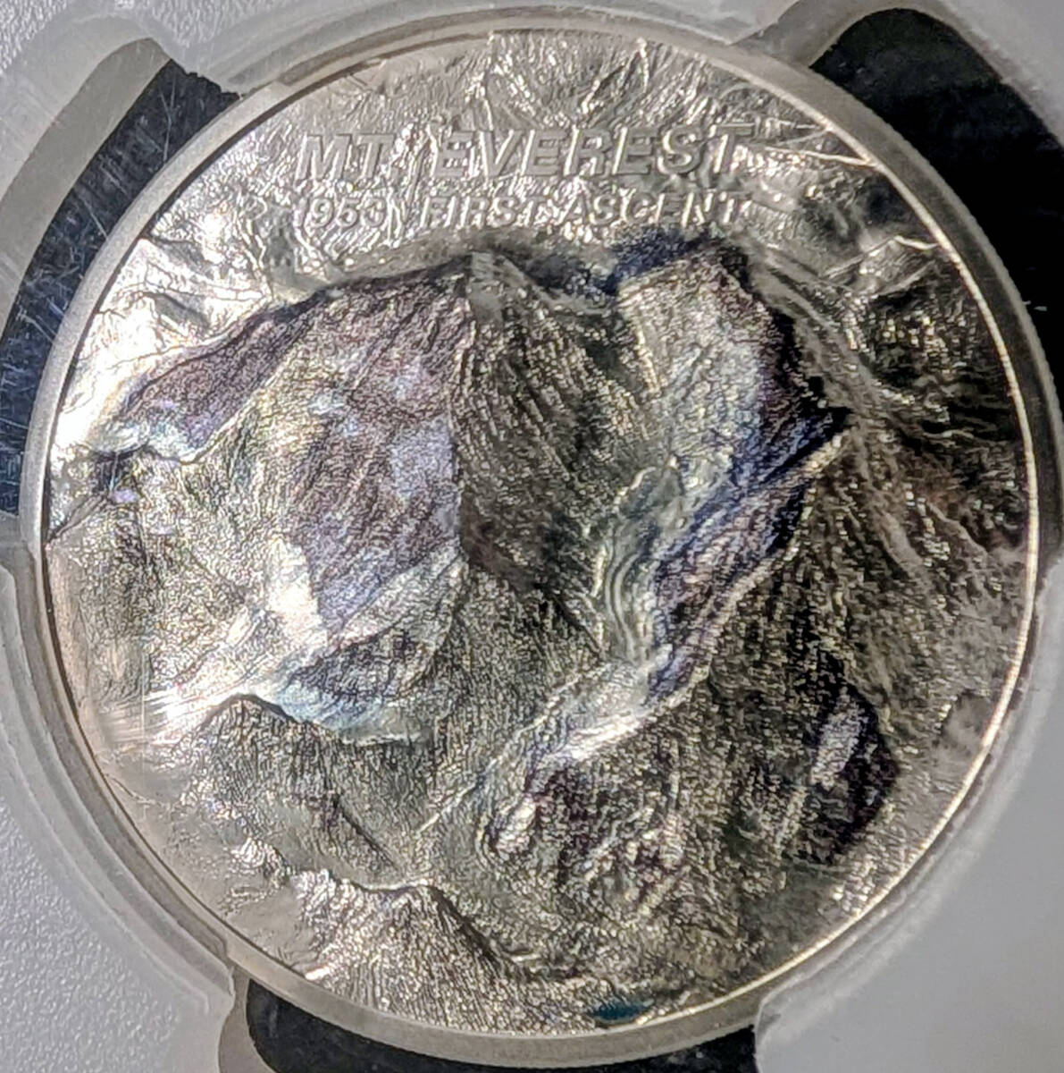 山をモチーフとした珍しいタイプの銀貨です。この銀貨は、クック諸島が2023年に発行した公式法定通貨で、世界最高峰エベレストへの登頂70周年を讃える特別な記念コインです。2オンスという大きな重量と、極めて高いハイレリーフ技術による立体的な造作が特徴で、標高8848メートルを誇るエベレストの雄大さと壮麗な自然を芸術的に表現しています。銀貨で描かれた山があまりにも魅力的なので、つい仕入れてしまいました。