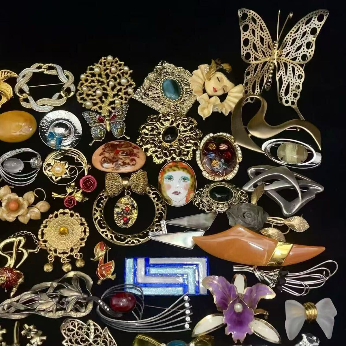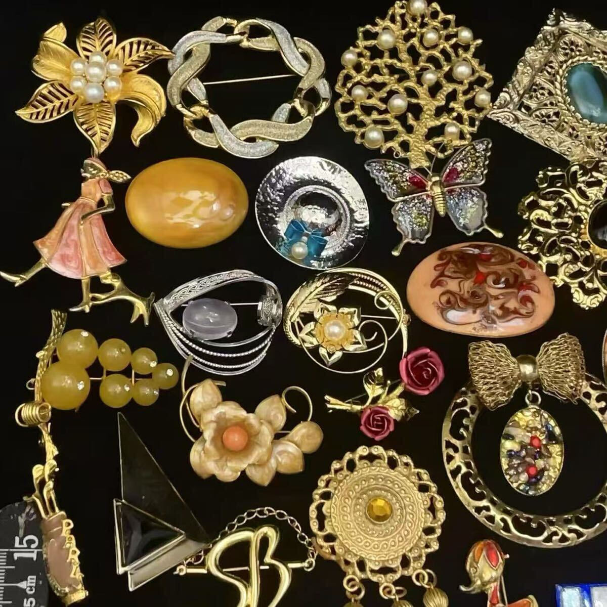 ヴィンテージ ブローチ50個まとめ 大量 天然石 七宝焼 パール ゴールド ラインストーン 黒蝶貝等 MONET/C'EST BIEN/PARTICOLARI他刻印含む