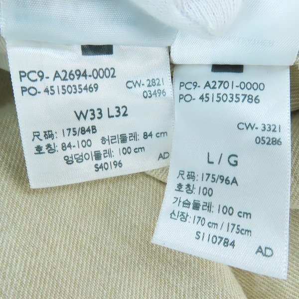 表記:ジャケット/L 実寸:約 (身幅61 着丈78)㎝ 表記:ボトムス/W33 実寸:約 (ウエスト84 股下80.5)㎝ ※恐れ入りますが、個別のサイズ詳細などの商品内容に関するご質問にはお答えすることが出来ません。何卒ご了承ください。 サイズチャートはこちらをクリック | |||||||||||||||||||||||||