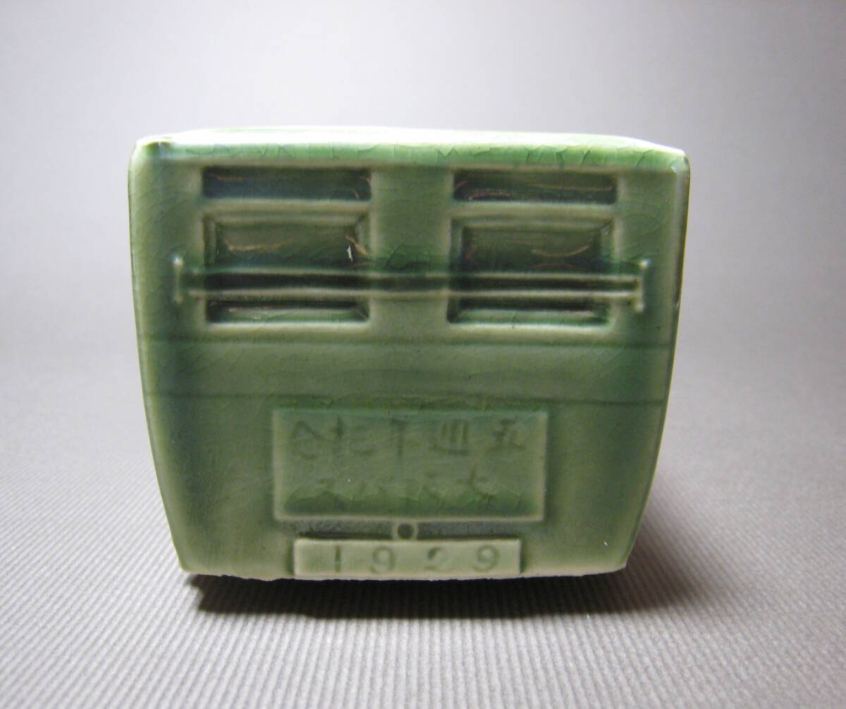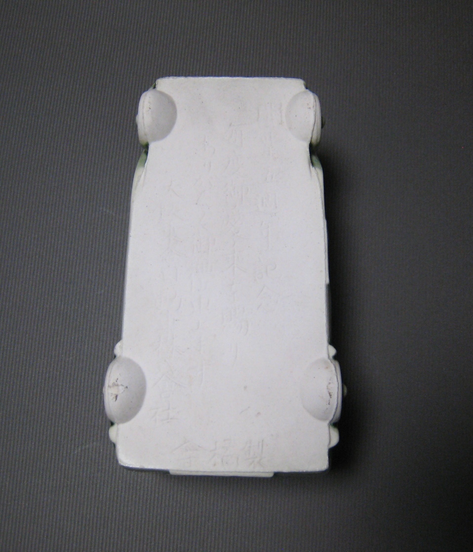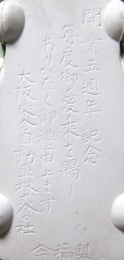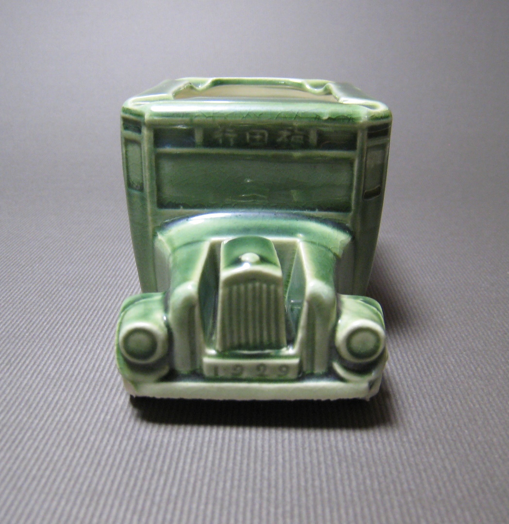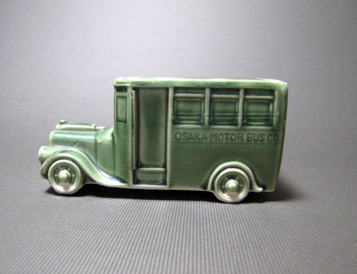 大正13年頃、営業の大阪乗合自動車(OSAKA MOTOR BUS)の陶磁器のオブジェです。裏面に記念文字が刻まれています。