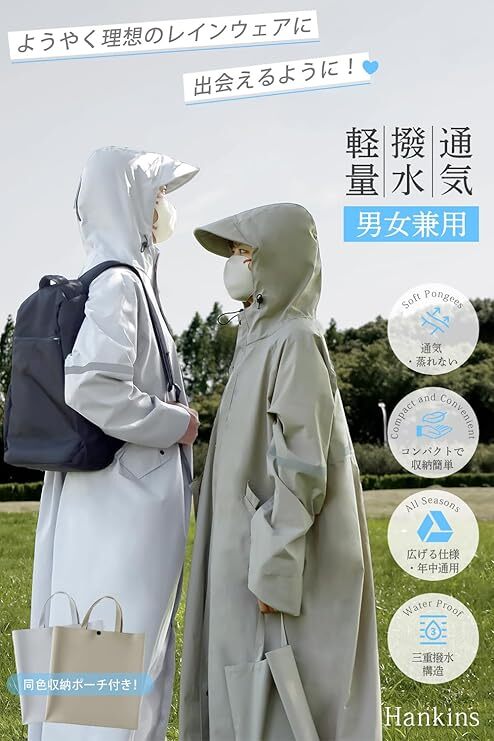 • ①【とにかく使いやすい!快適レインポンチョ】 「サッと羽織るだけ」の簡単装着!軽量で肌に優しいポンジー素材を使用しているから、雨の日でも蒸れにくく、ずっと快適。15000mmの高い防水性を持ちながら、通気性もバツグン。朝の慌ただしい通勤時でも、アウトドアでも、ストレスなく使える1枚です。