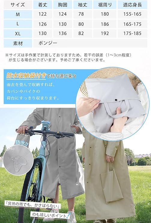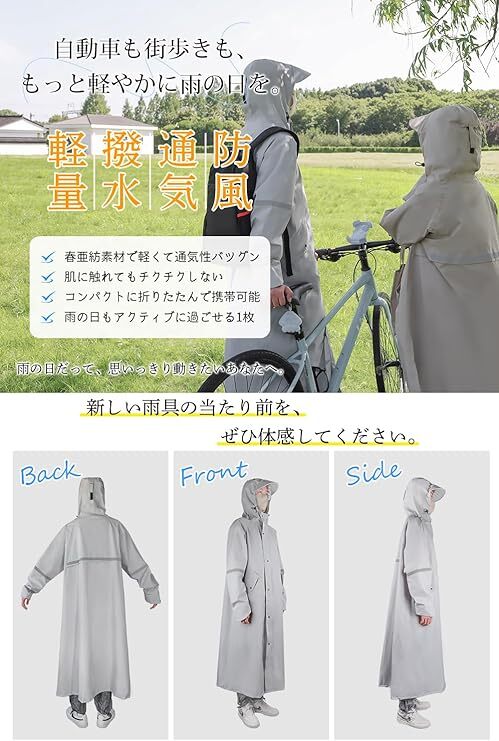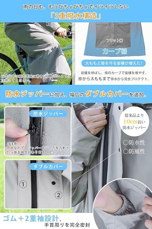 • ③【自転車&リュックにも対応!便利なゆとり設計】 裾を広げれば自転車のペダルを漕いでも膝が濡れない!バックパックを背負ったままでも楽に着られ、360°反射テープで夜道も安全。通勤ユーザーに嬉しい工夫がいっぱいです。