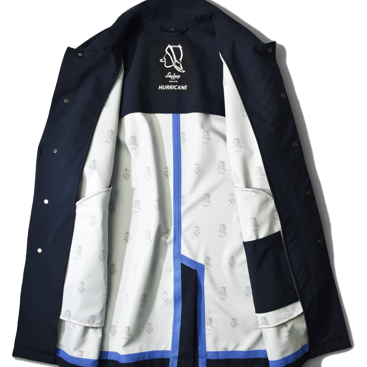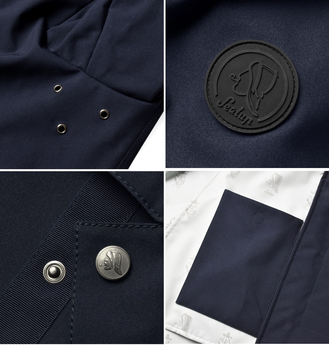 フロントトップのスナップボタンも同様のロゴ入りボタン。 右前立てにはグログランテープ補強。ボタンを開ける際に強めに引っ張っても破損する心配はありません。 内側をめくると、裏地のもアイコンが散りばめられており、脱いでもさりげなくシーラップであることを主張します。 グレーの裏地にブルーの防水テープの色合わせも洒脱。こういった気配りは、創業以来¨見られること(見せること)¨を 意識しているココンチならではです。