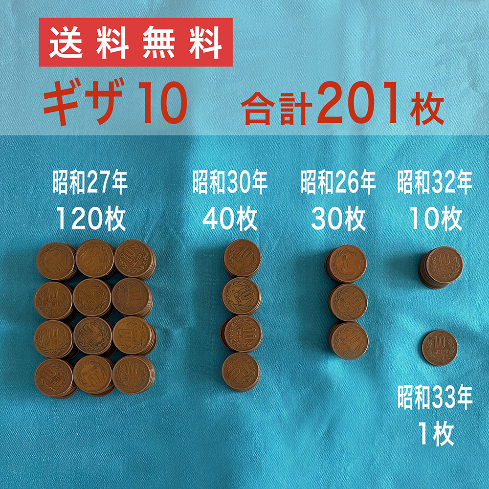 「ギザ10」合計201枚 昭和33年あり 昭和26年 昭和27年昭和30年 昭和32年 昭和33年 ギザ十 硬貨 青銅 10円 10円玉 十円玉 日本硬貨