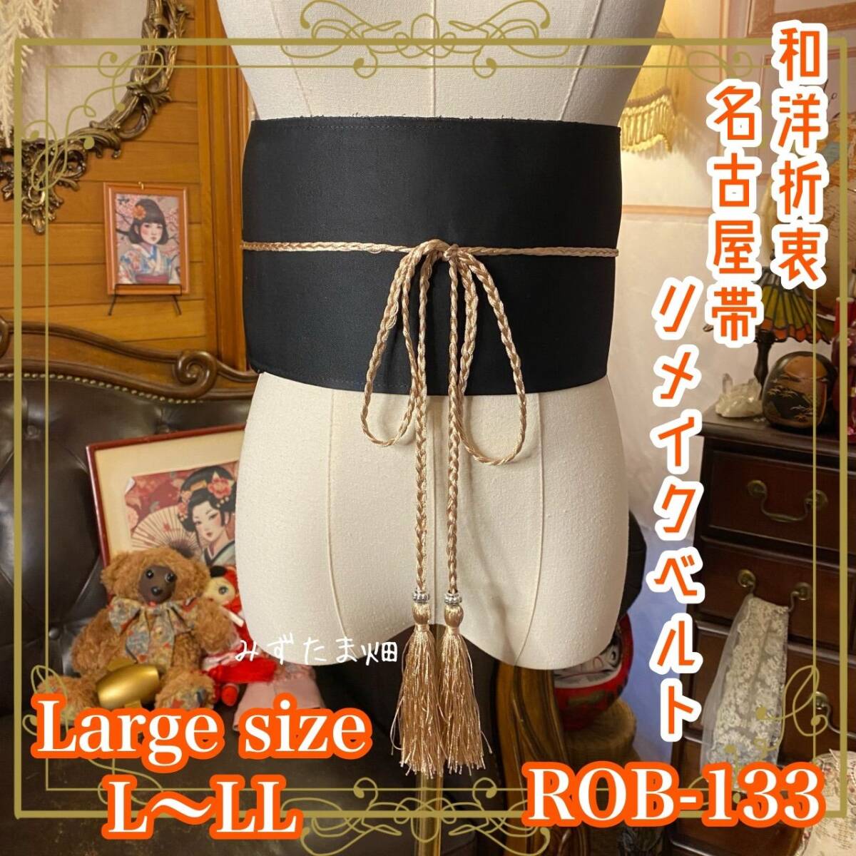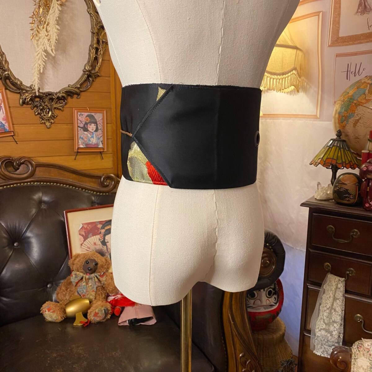 【名古屋帯 リメイク サッシュベルト 飾り帯 和洋折衷 ハンドメイド レトロ 古着 L〜LL対応 艶やかな墨黒に緋紅の大輪花 ROB-133】