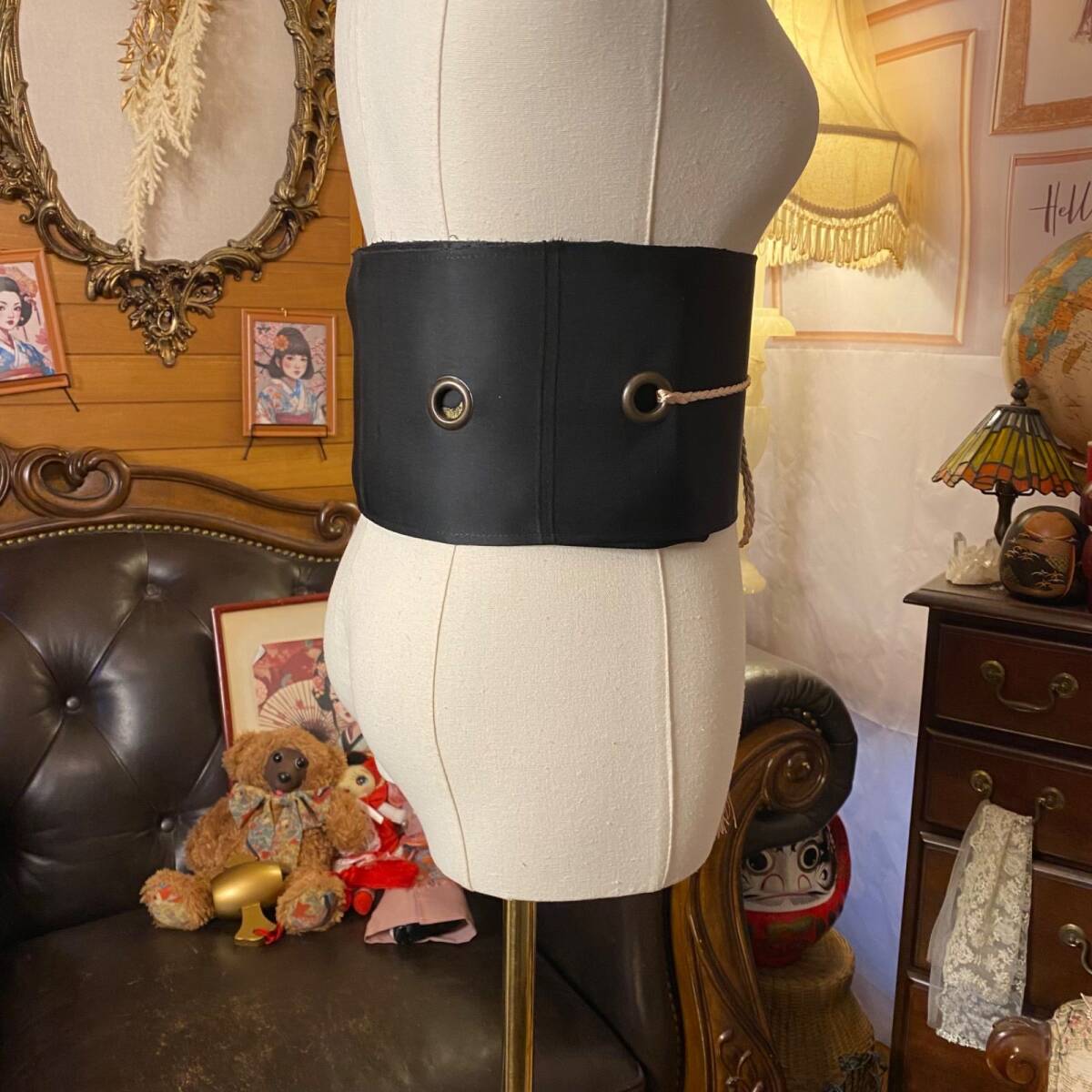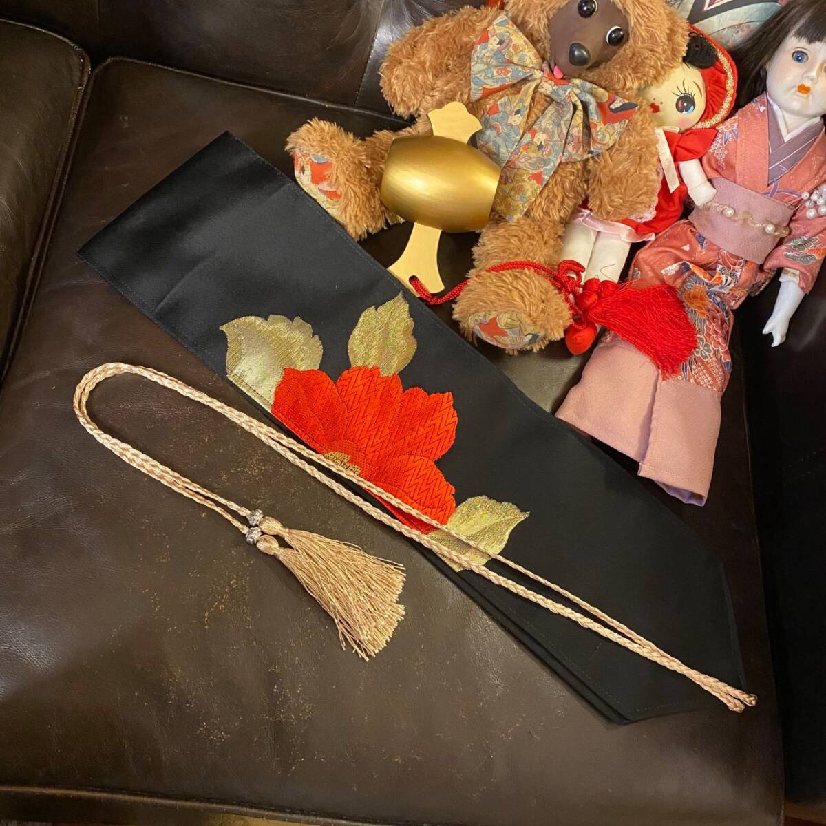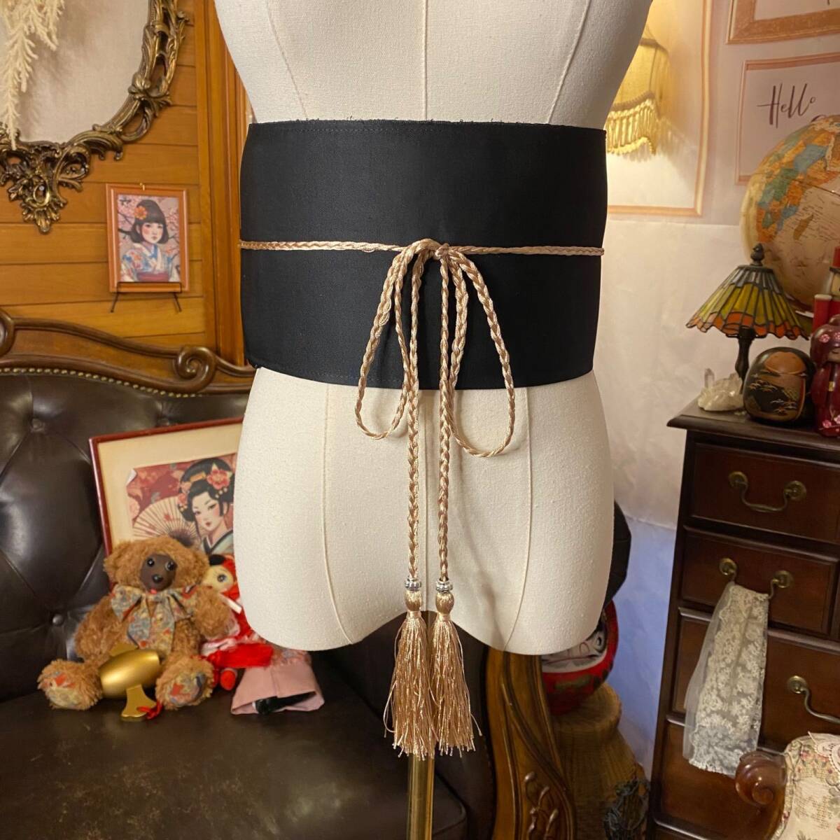 艶やかな墨黒の名古屋帯をベルトに。前面に、緋紅の大輪花(椿を思わせる)と金糸を含む葉をきゅっとレイアウト。留めはハトメ仕様×シャンパンベージュの組紐タッセル。黒×赤×金のコントラストで、巻くだけで装いがぐっと和モードに。