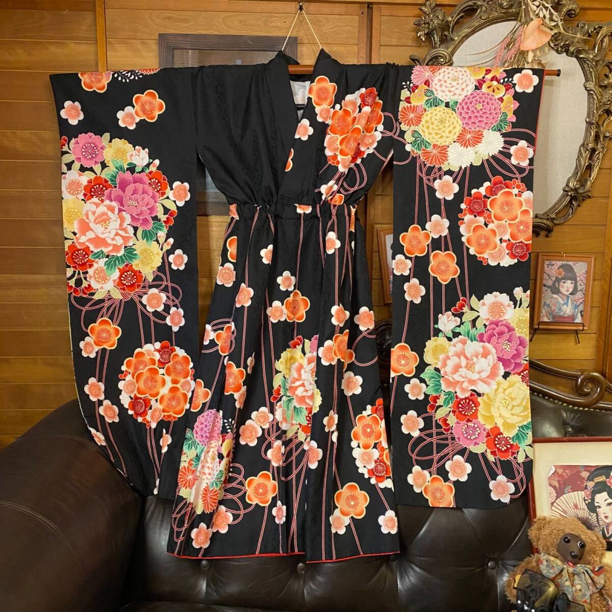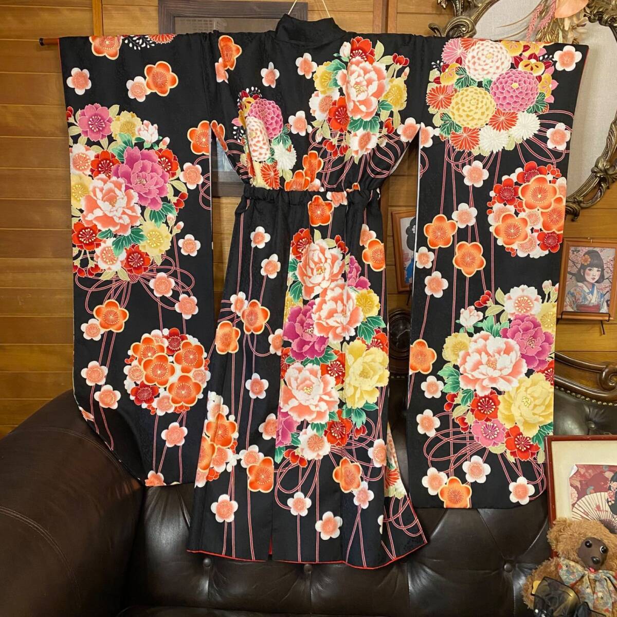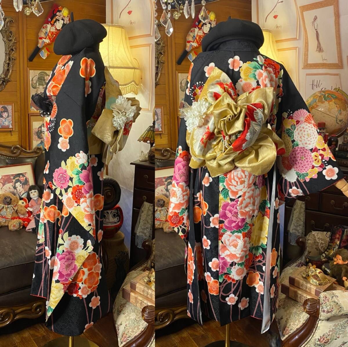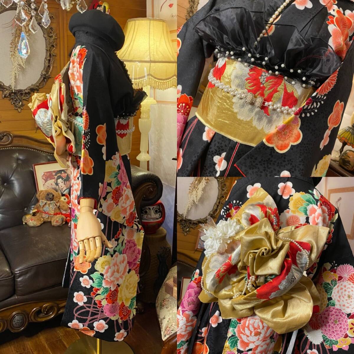 【 振袖 着物 セミロングワンピース ドレス 2部式ローズ/バラ作り帯 リメイク 洗える 化繊 パールつけ襟 フリルシフォン帯揚げ 和洋折衷 ハンドメイド レトロ 古着 艶をはらんだ漆黒(花地紋入り)の地に、牡丹・梅・菊などの大輪が咲き競う華やぎ柄。 FKW-33】