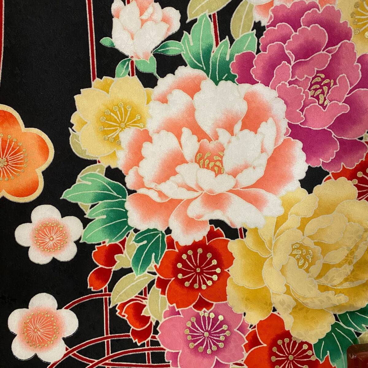 艶をはらんだ漆黒(花地紋入り)の地に、牡丹・梅・菊などの大輪が咲き競う華やぎ柄。