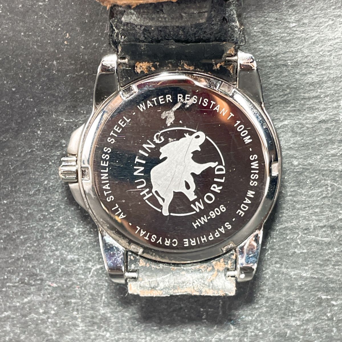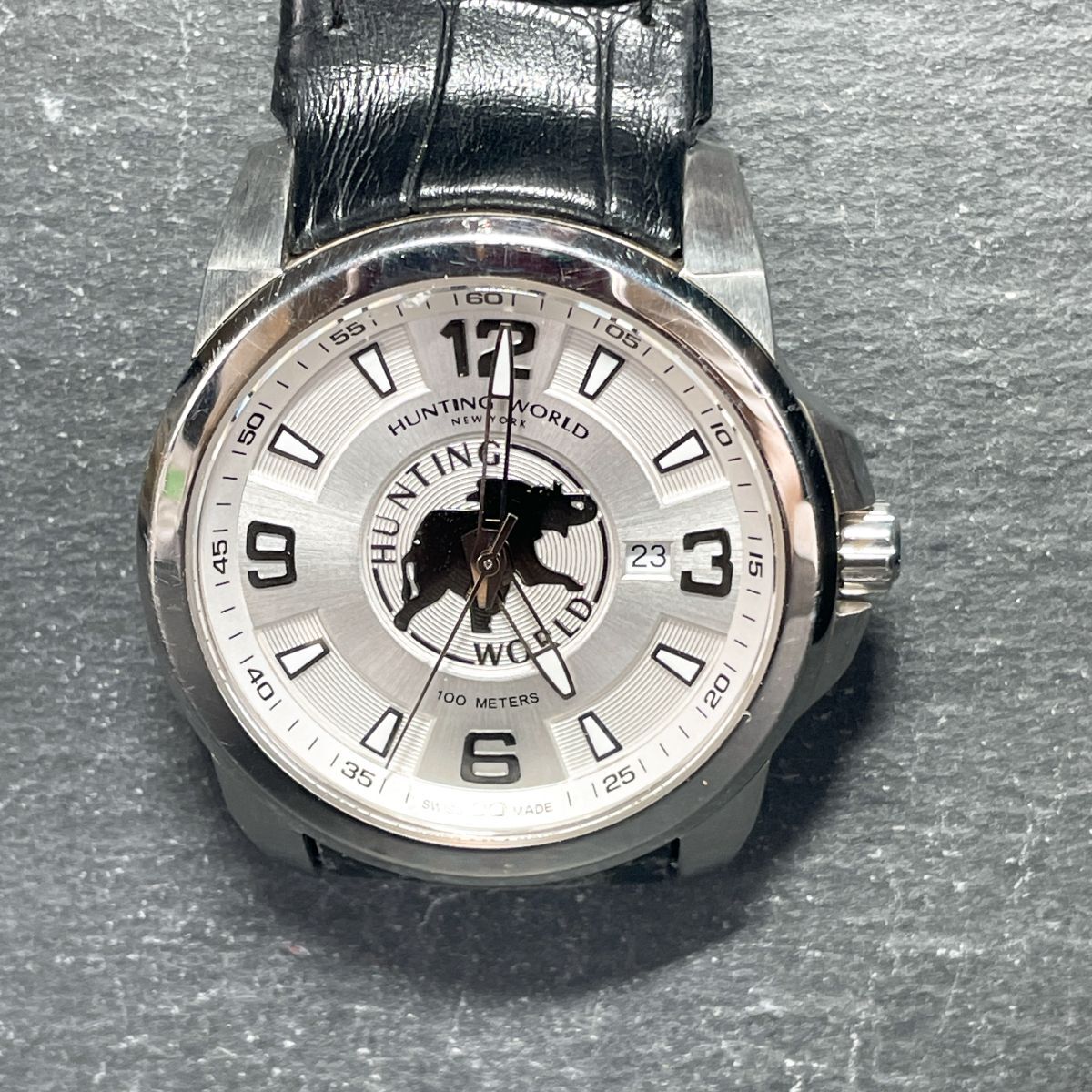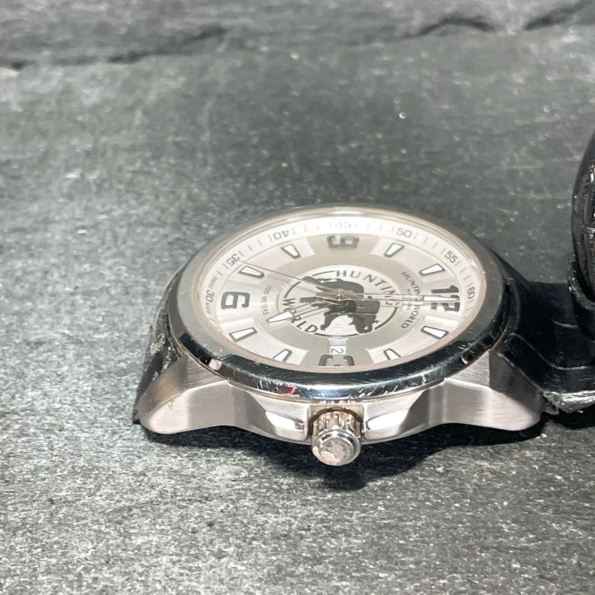 HUNTING MORLD ハンティングワールド HW-906 腕時計 アナログ クオーツ 3針 カレンダー ホワイト文字盤 レザーバンド ブラック ラウンド
