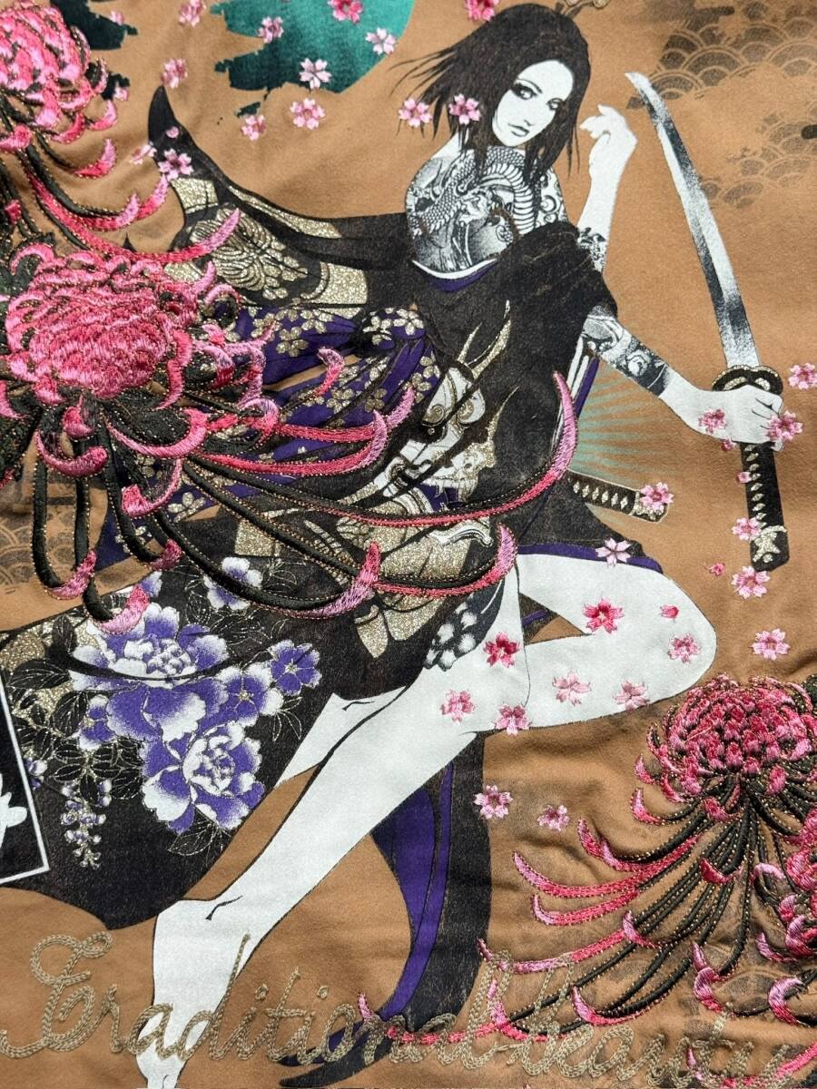 合成皮革(モールスキン)のボディに刺繍やプリントでデザインを施したジャケットです