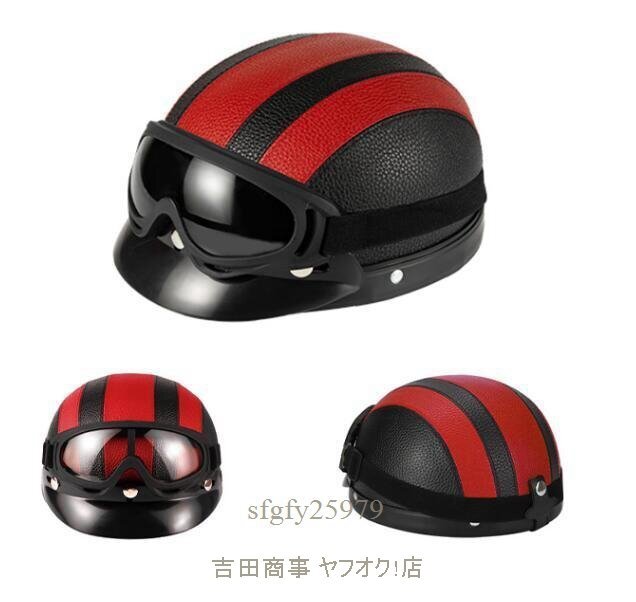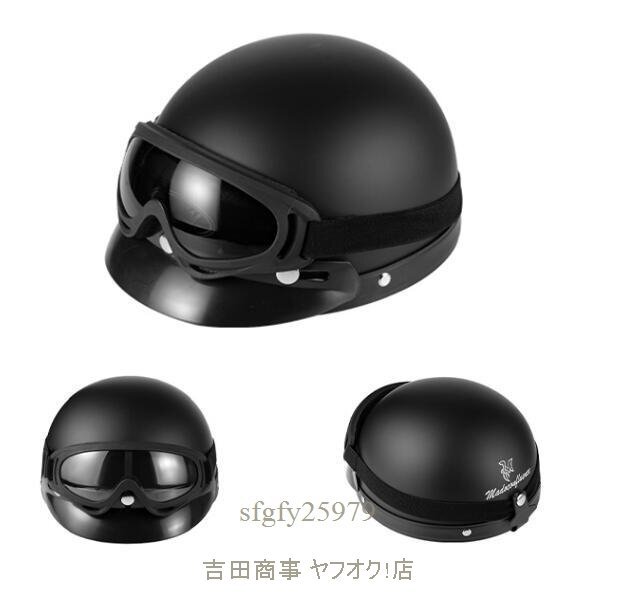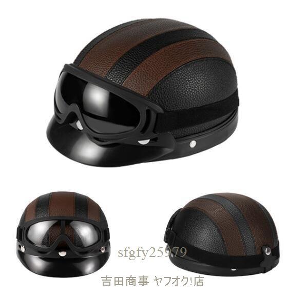 B0271☆新品 レザー調黒マット原付ヘルメット半ヘルハーフヘルメット ハーレー 半キャップ半帽子 ゴーグルバイザー付き 自転車 男女兼用