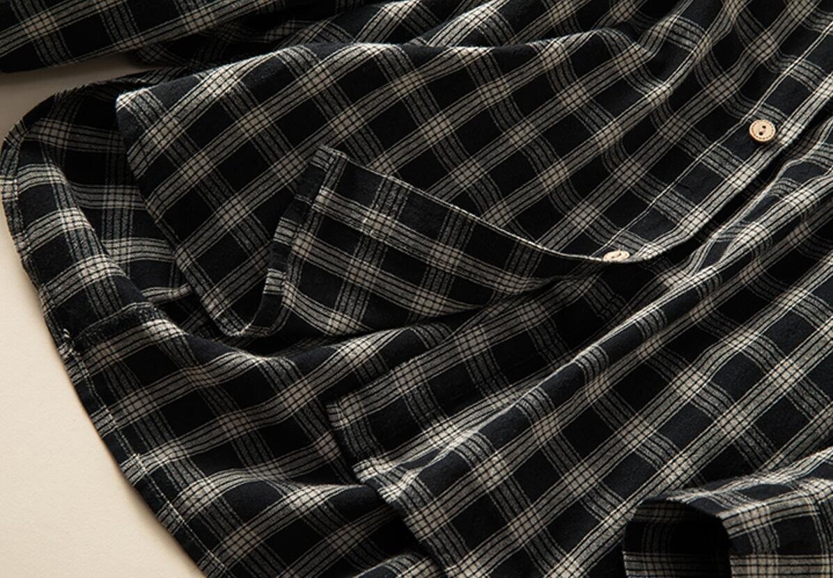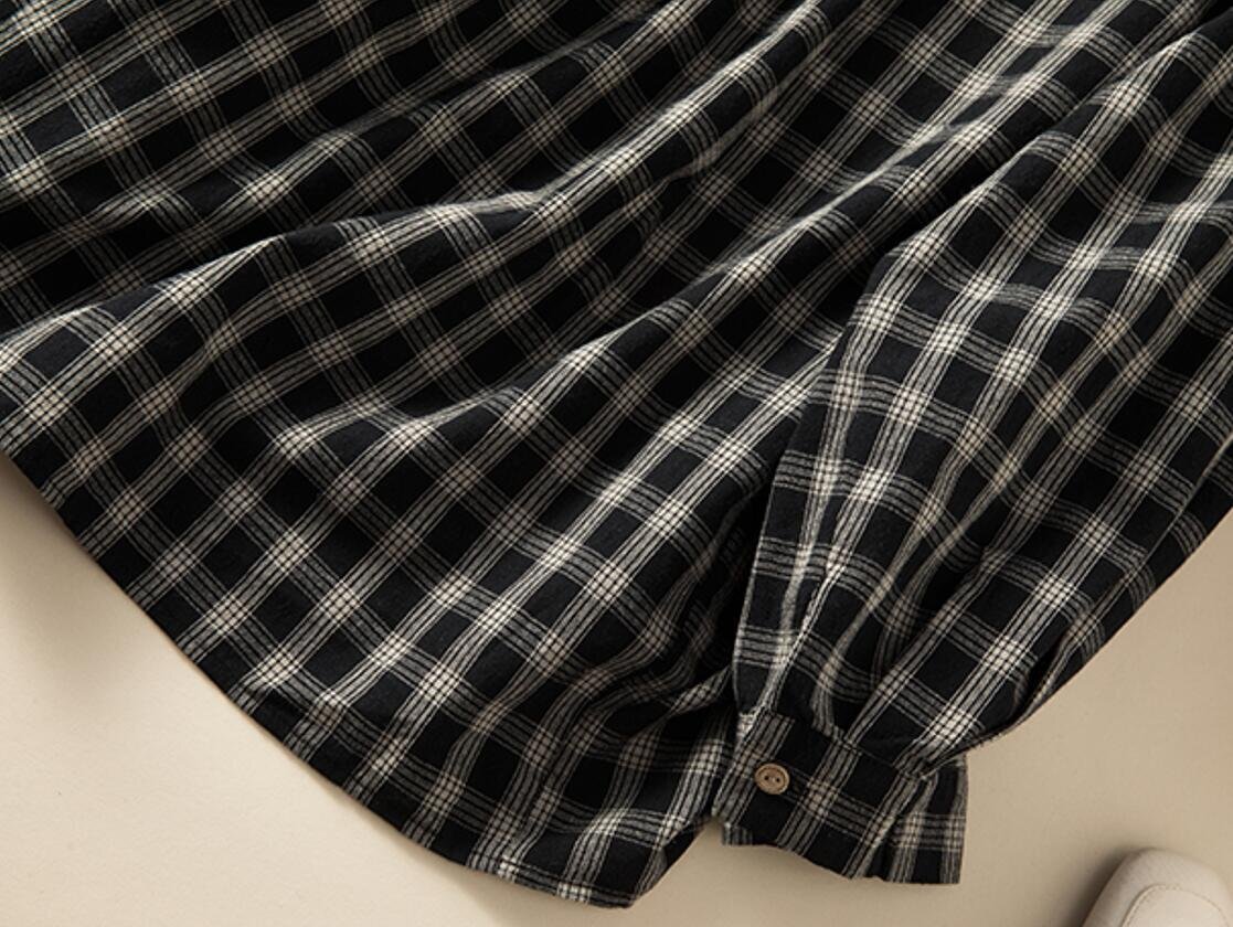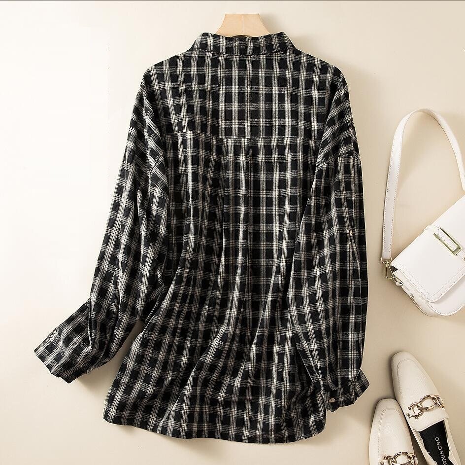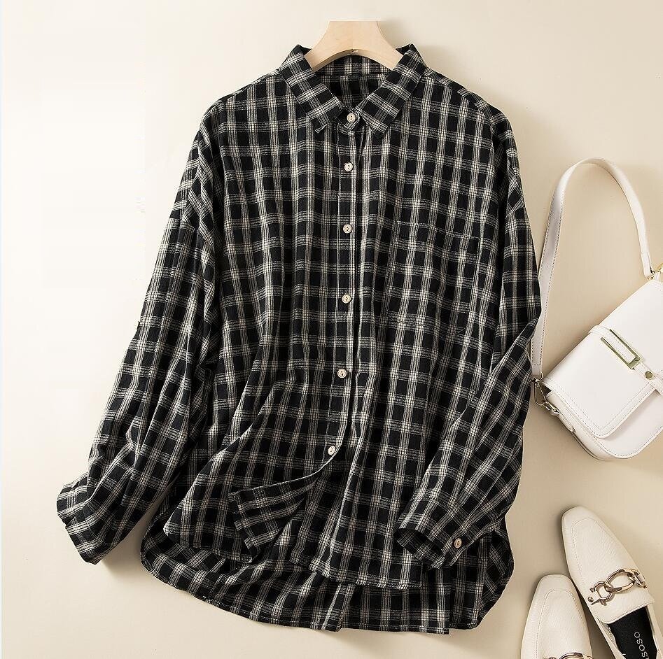 秋新品 ブラウスシャツ レディース チェック柄 綿麻 リネン 長袖 トップス ゆったり 大きいサイズ ★ 黒/Lサイズ