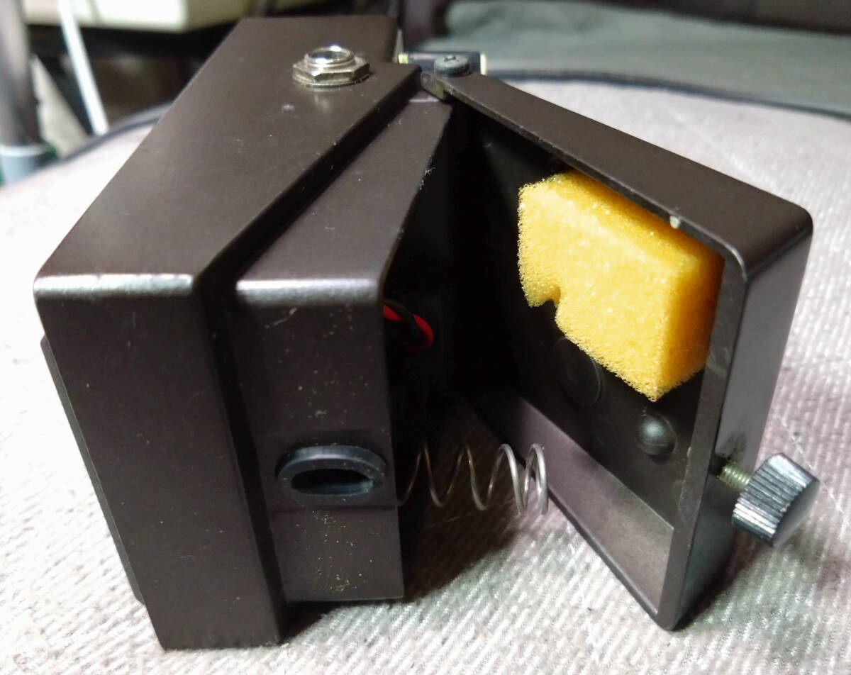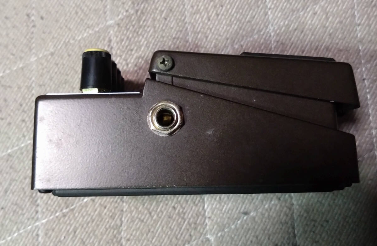 念のためPSA-100に単体で接続し、軽く音出し確認してみましたがガリなども無くON/OFFもきちんと動作していると思います。入力側にケーブルを挿して電源を入れてペダルを踏み、LEDが点灯している様子が2枚目の写真となります。ACアダプタ駆動しかしていませんが電池ボックス部の劣化しやすいゴムは交換済みです。