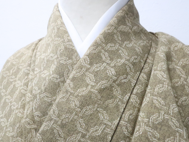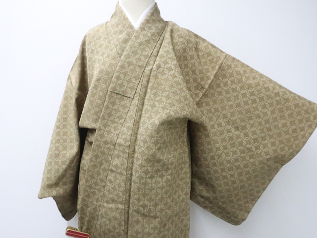 リサイクル商品のため、衿裏スナップボタン汚れがございますがご着用いただけると存じます。 地色はカーキです。 1枚目の画像が近いお色かと思われます。 素材は正絹です。 日本国内から発送いたしております。 発送後は追跡番号をお知らせいたします。 スタッフによる手作業での検品採寸済み。 |