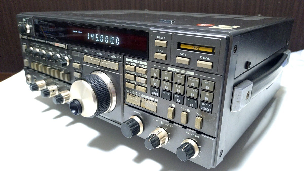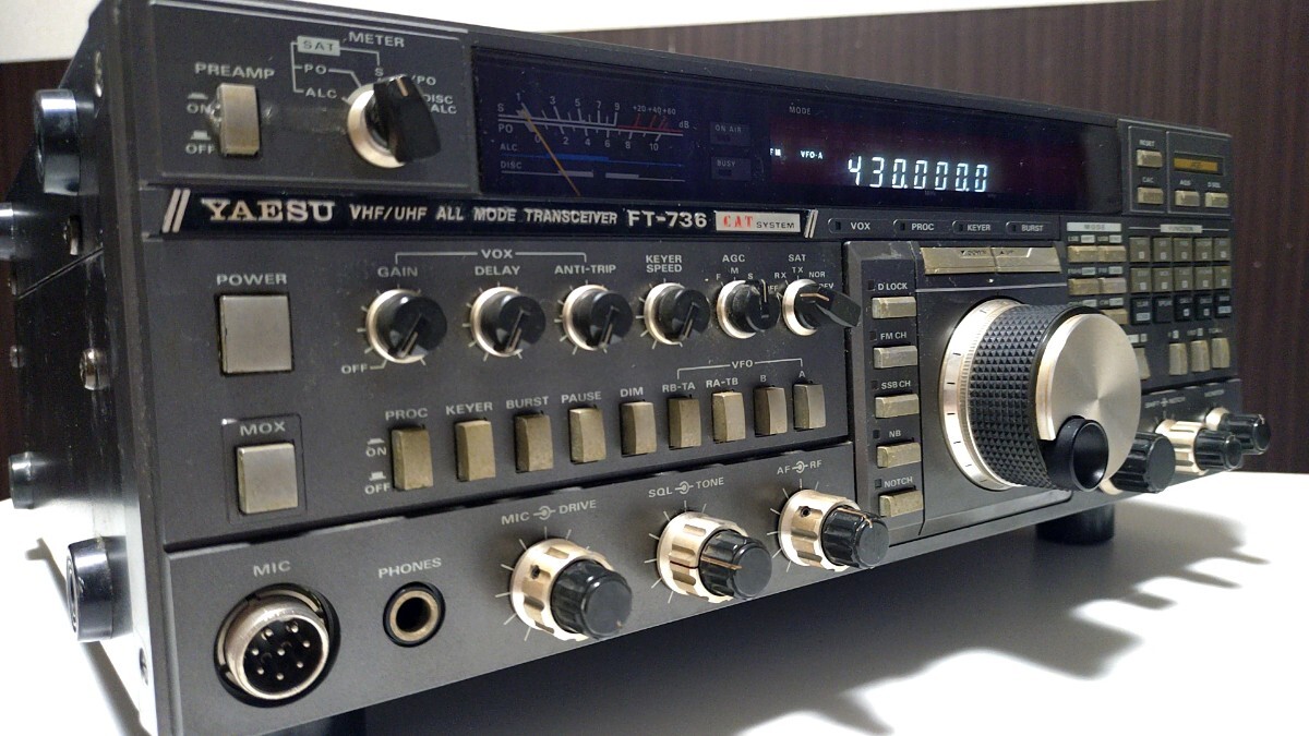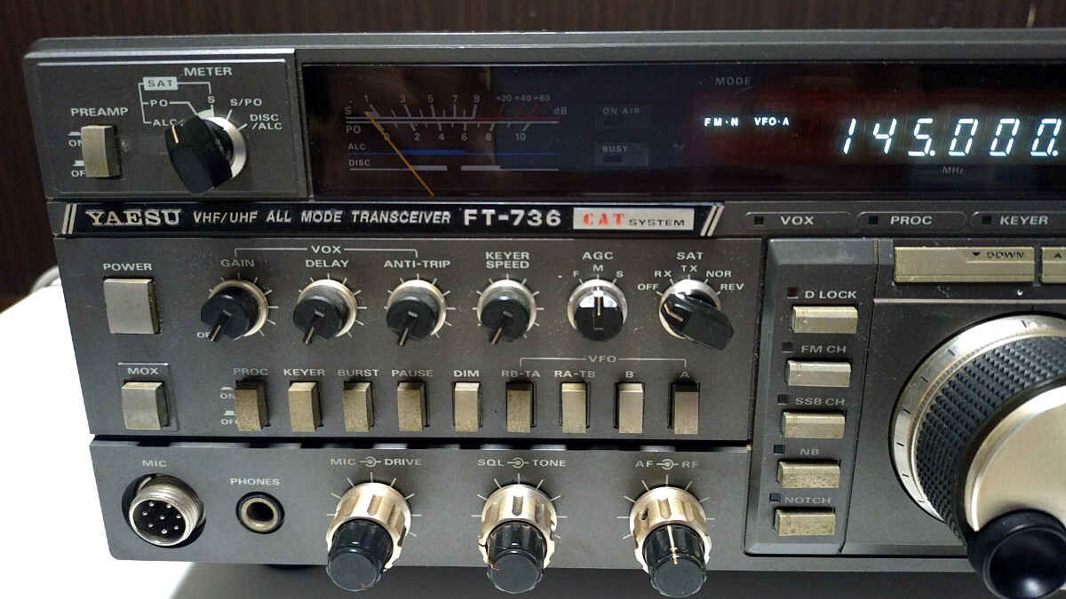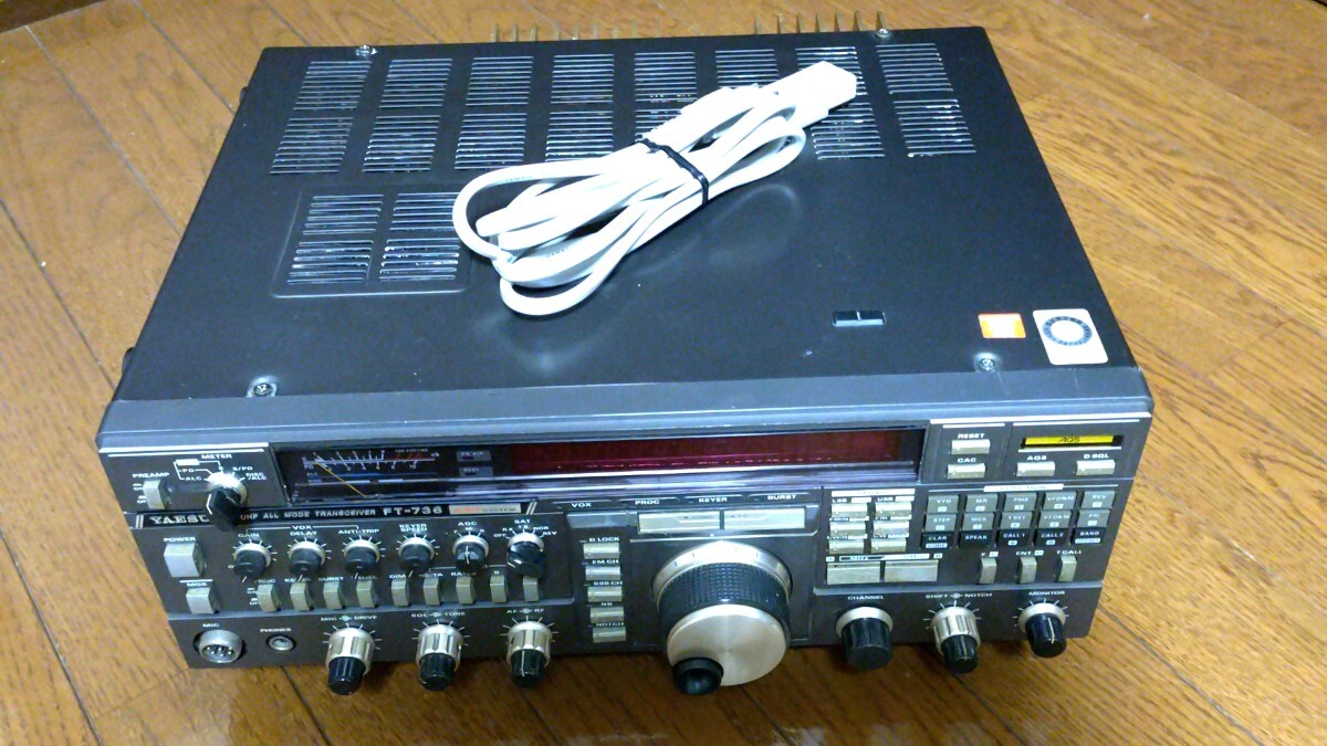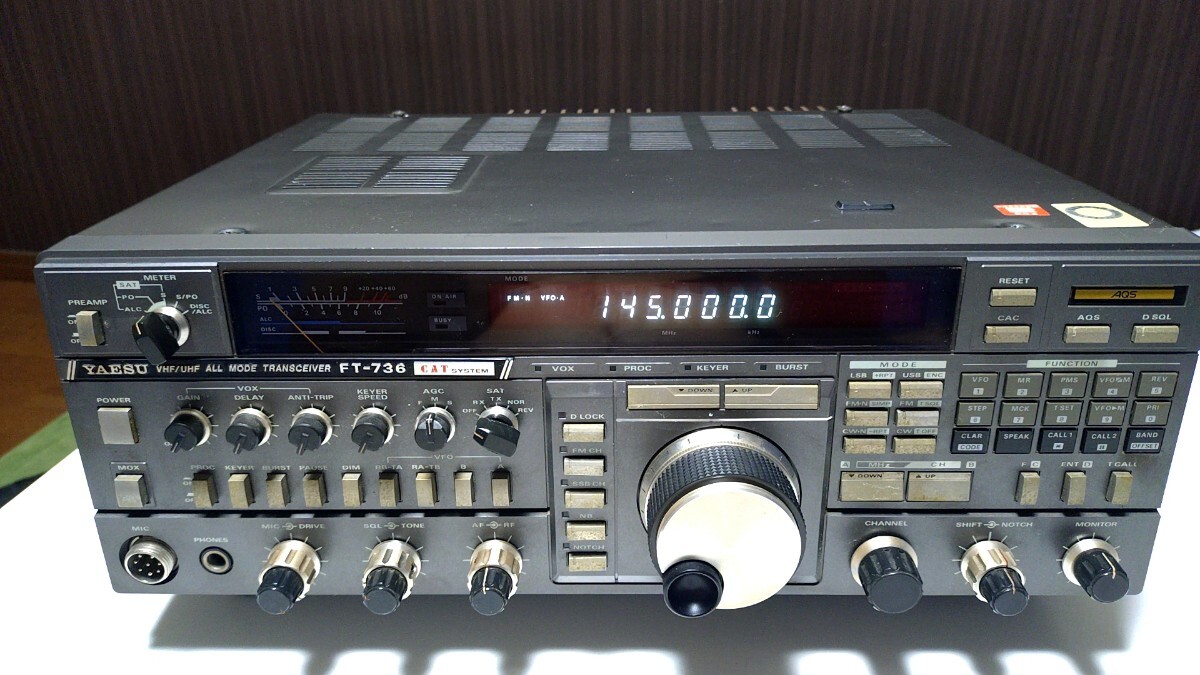 ヤエスの【FT-736】です。動作確認については、144MHzは10w以上の出力を確認していますが430MHzは出力なしです。アンテナがなく確認はできていませんが、両バンドでSSB、FMともに受信はできそうです。