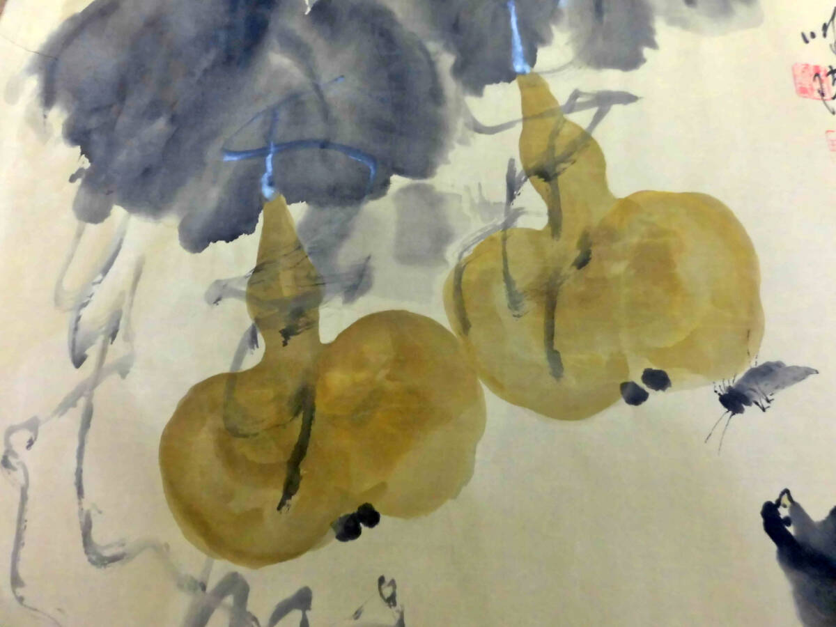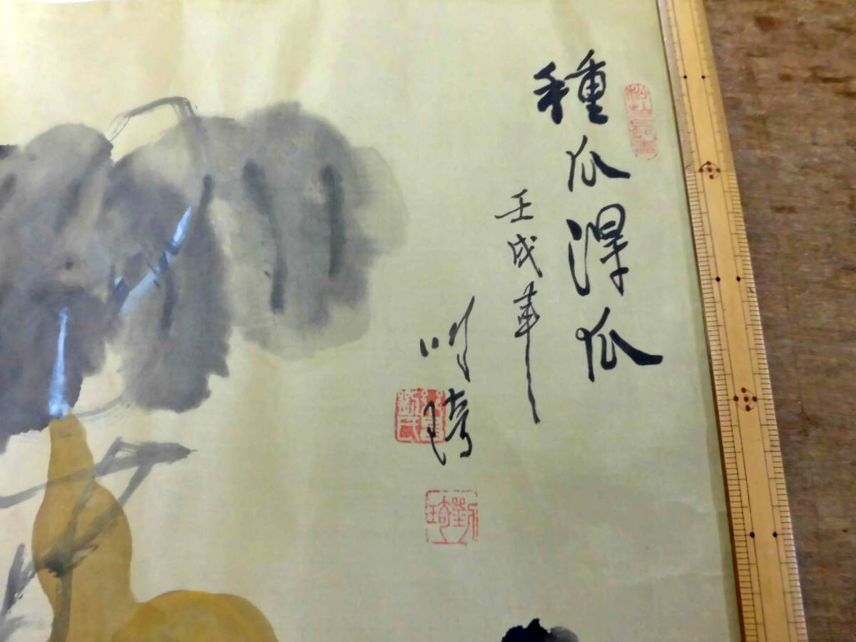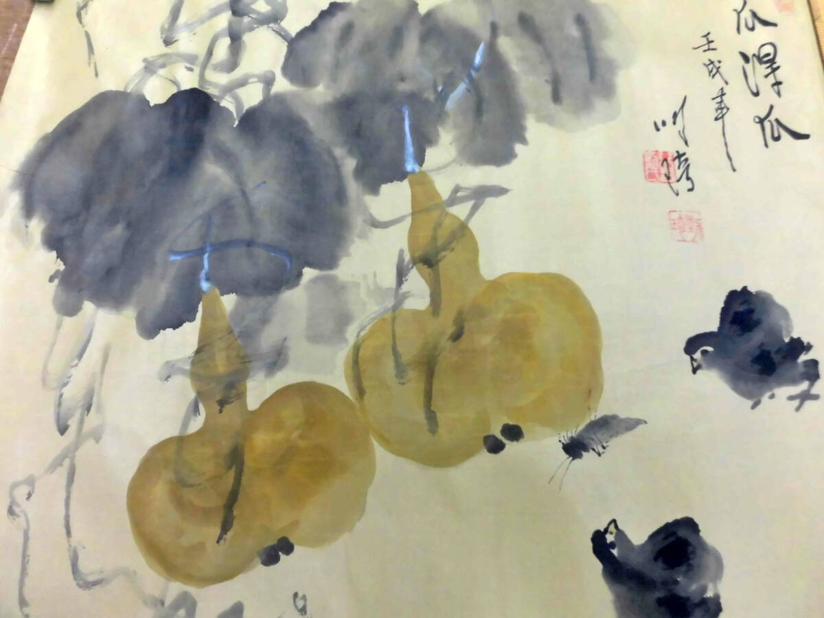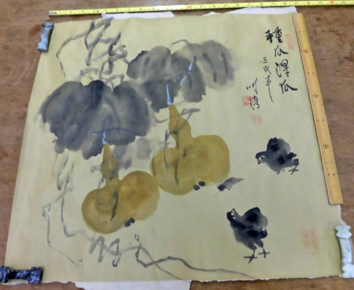 品名:まくり 瓜と鶏図 肉筆 絹本 作家:唐もの 寸法: 画像の定規でご判断ください。 状態:画像にあります四隅のオサエは出品には含まれません。 できるだけ説明いたしますが、写真でご判断ください。 写真の色の誤差はご容赦ください 出品者の主観です:折ってレターパックで発送します。真筆でない場合は返品を承ります。 | |||