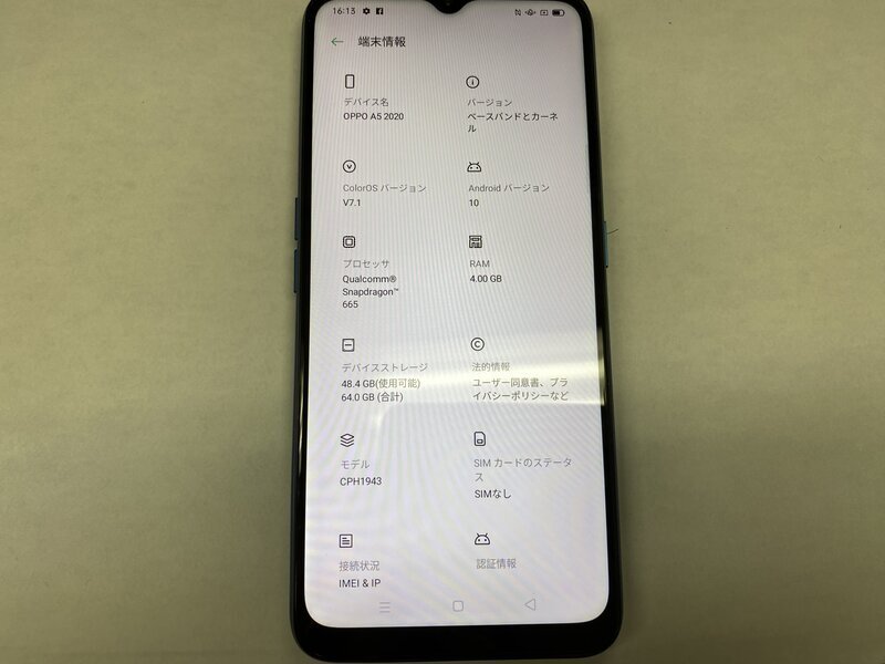 EK393 SIMフリー 楽天モバイル OPPO A5 2020 CPH1943 ブルー