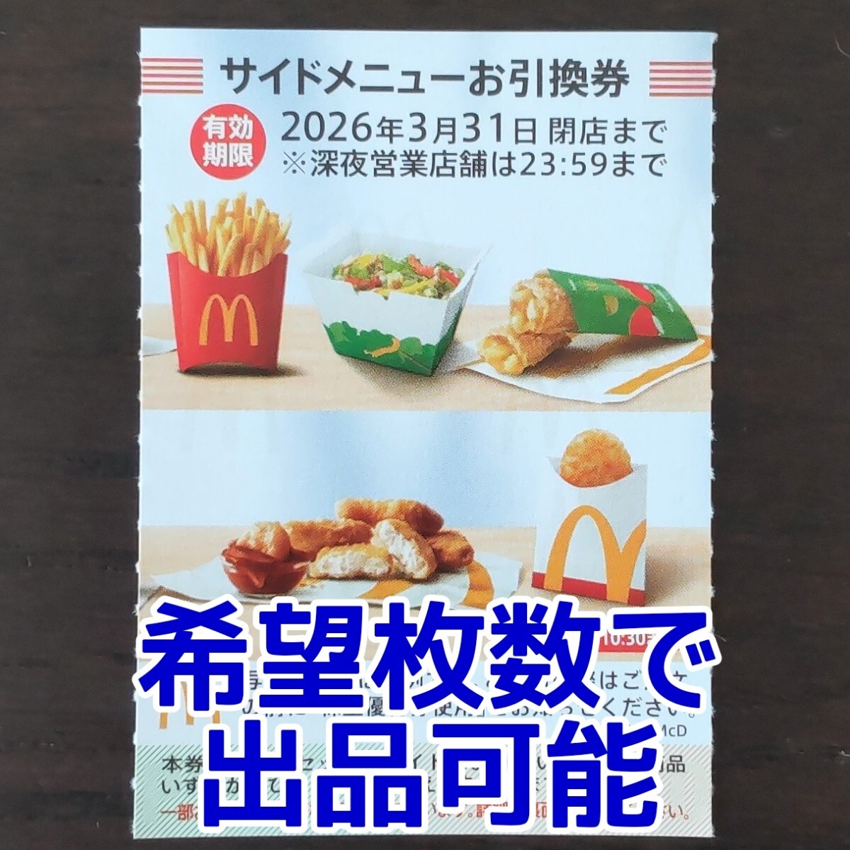 サイドメニューお引換券(ポテト・ナゲット・サラダのいずれか1つ)1枚です。
