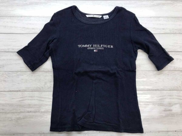 トミーヒルフィガー TOMMY HILFIGER アメカジ アーバンマクブリング モード Y2K リブ 五分袖 カットソー Tシャツ レディース 綿100% S 紺 です。
