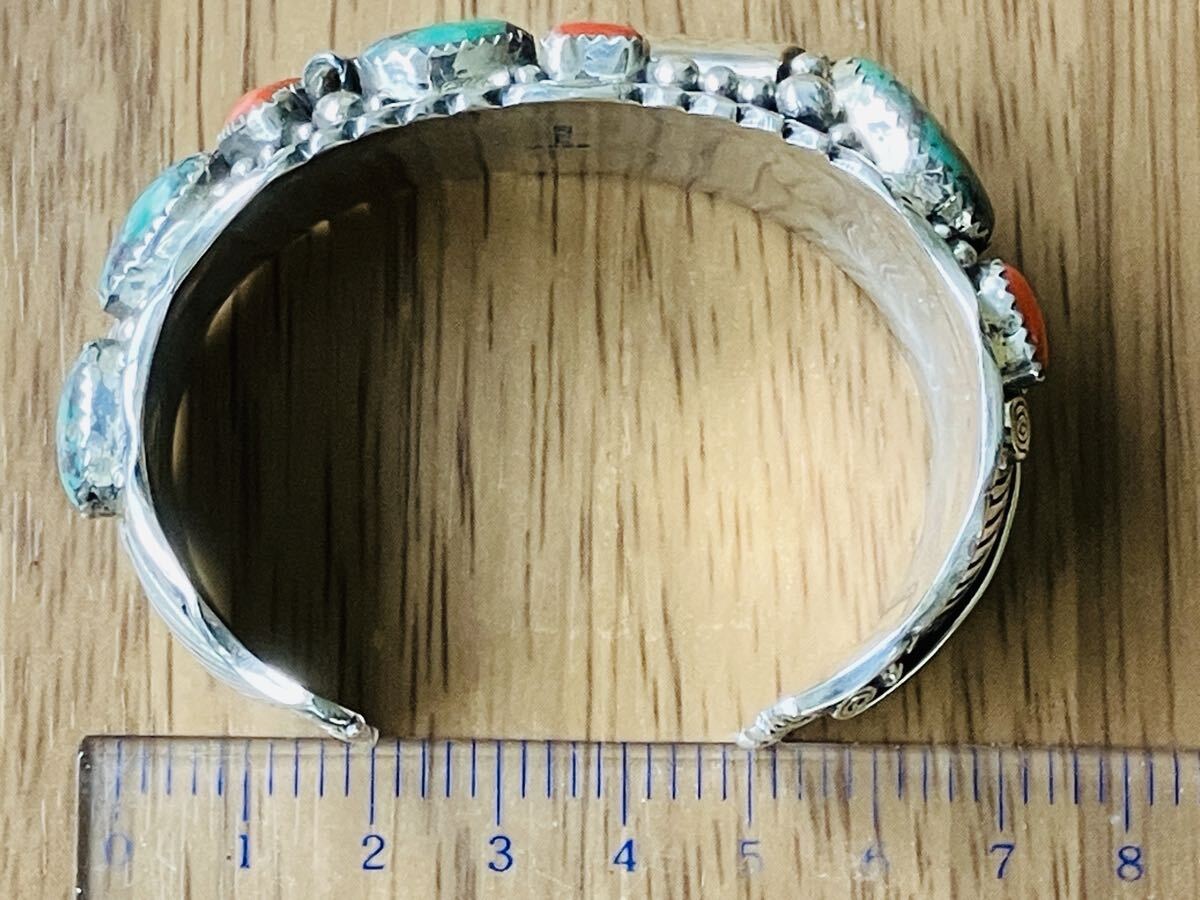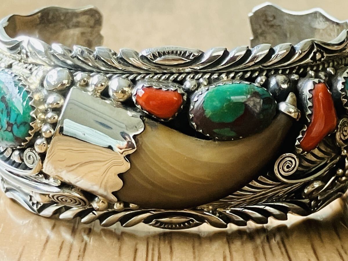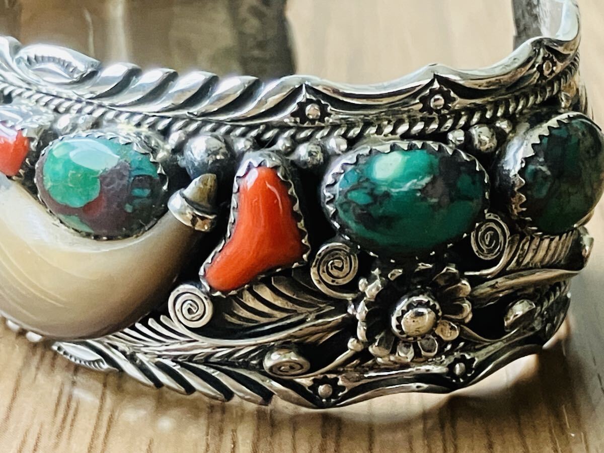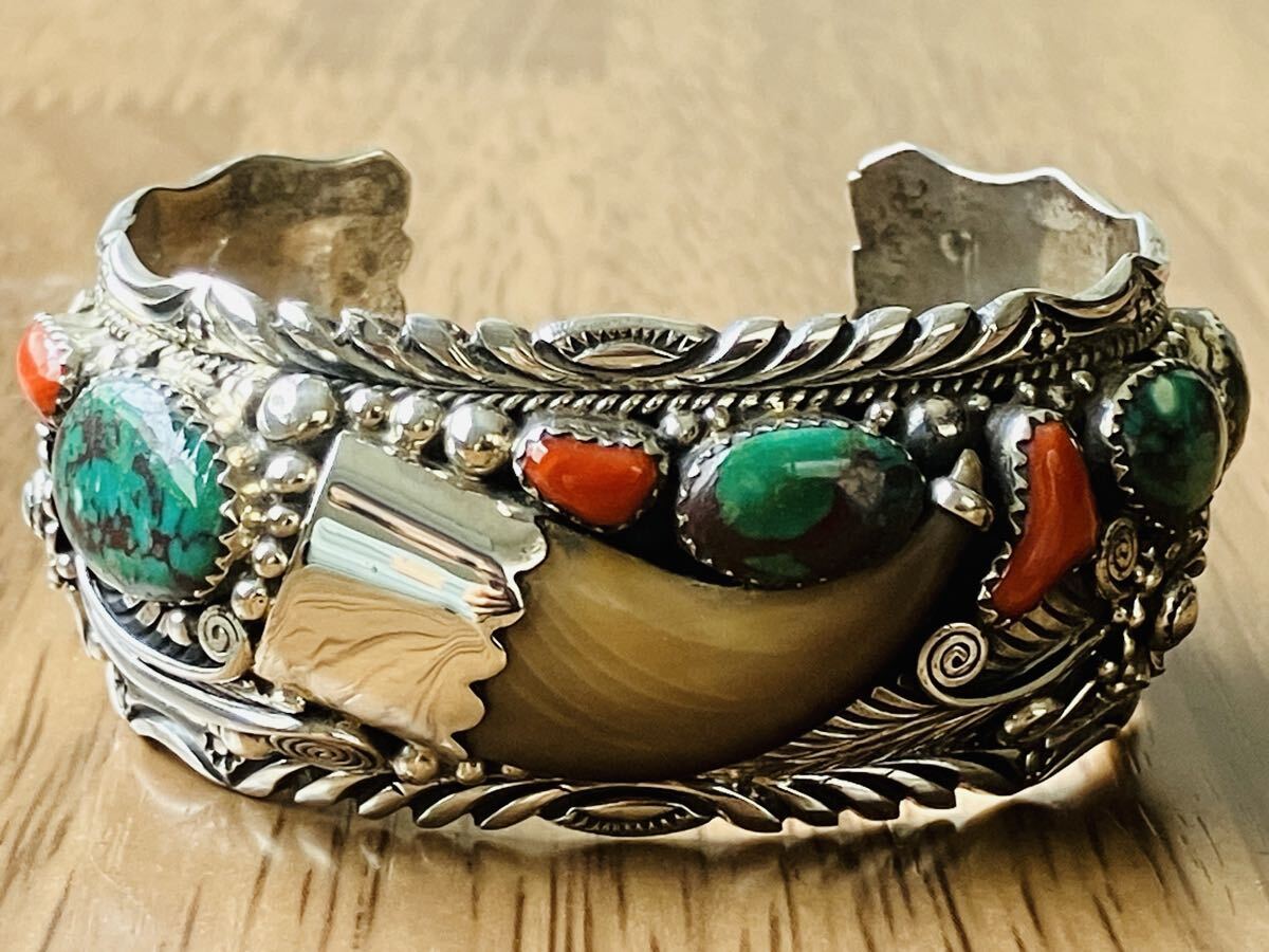 インディアンジュエリー バングル シルバー925 ブレスレット ターコイズ コーラル ベアクロー ナバホ族 Navajo 未使用