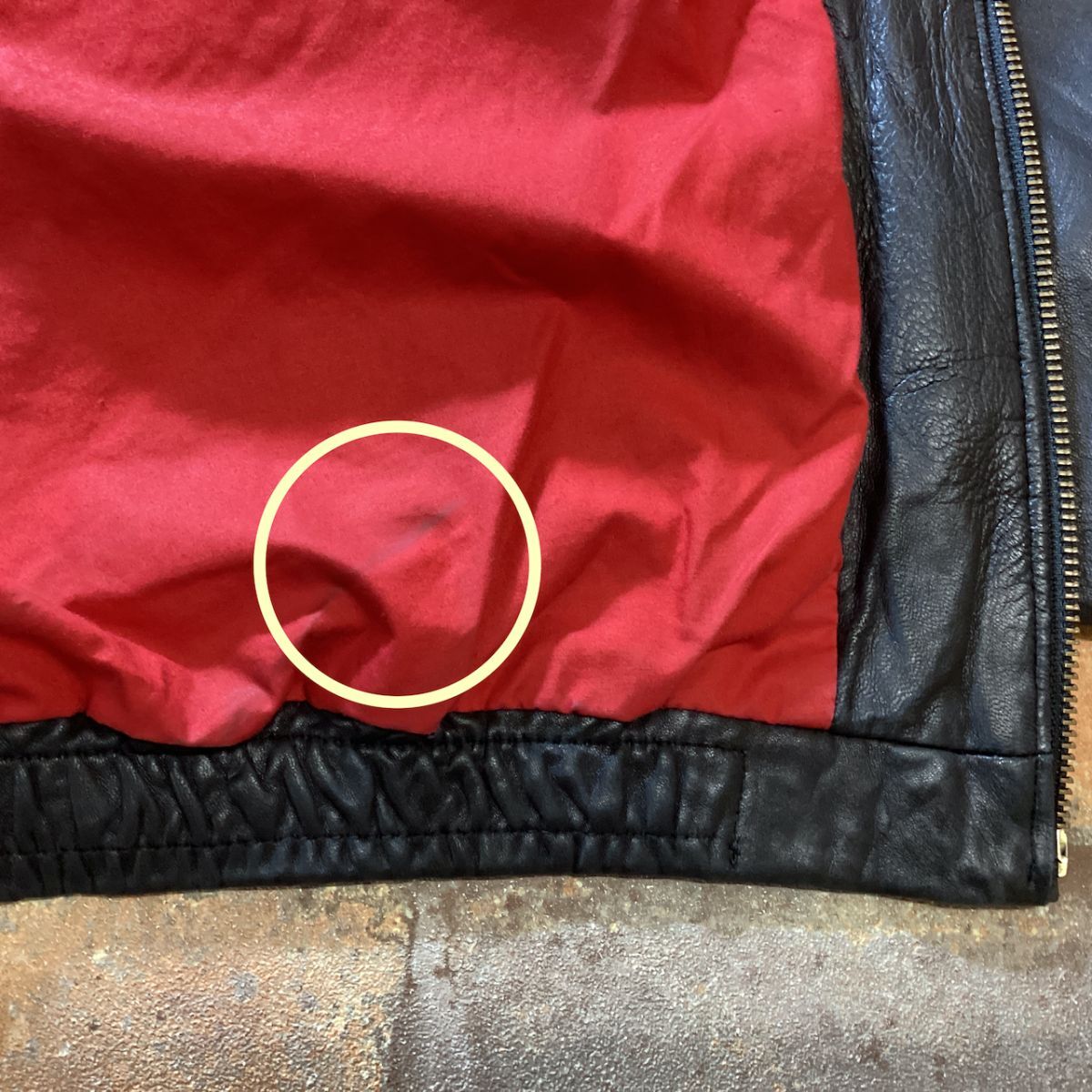 ジップの下右側に2cm位のステッチ解れ、
