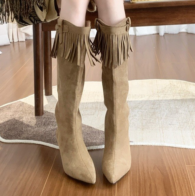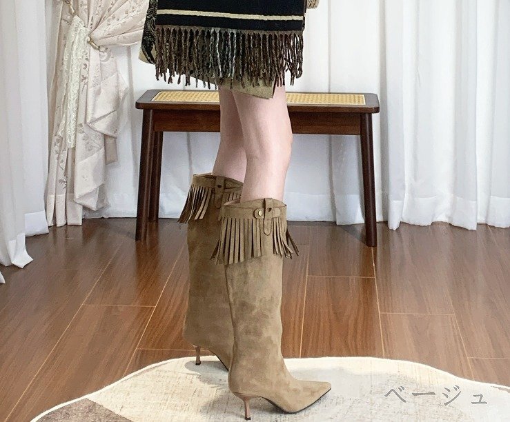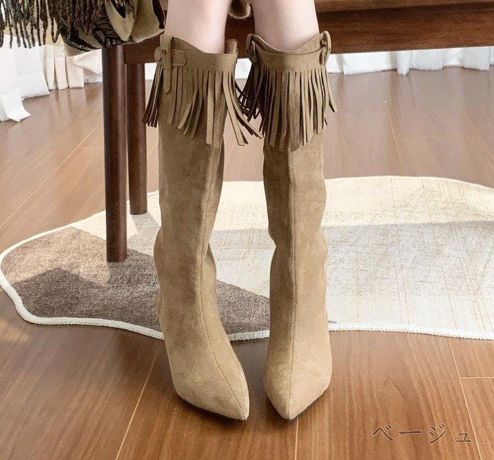 ブーツ フリンジ とんがりトゥ 切り替え シンプル 【37】23~23.5cm ベージュ