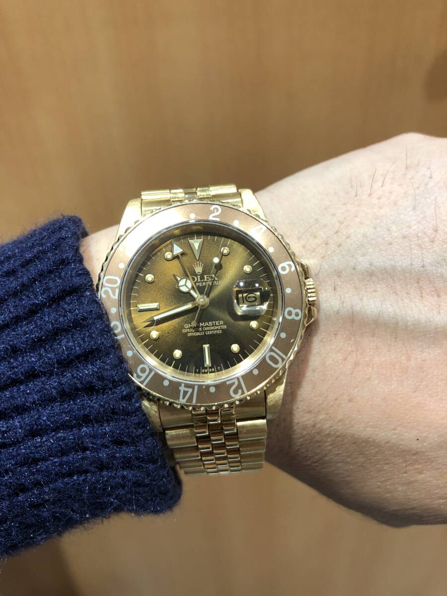 1979年GMTマスターは22金の様な濃い金色が特徴で上品さと重さ150gのデイトナステンレスとほぼ同じ重さで軽く普段使いできます。