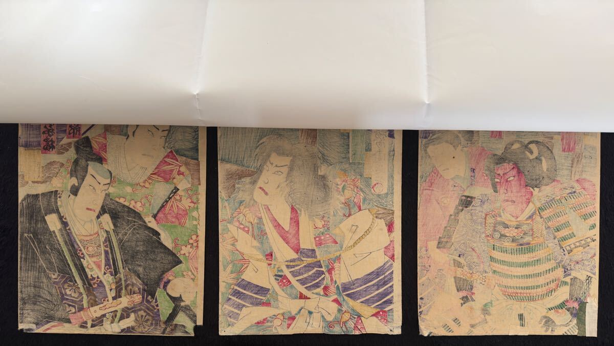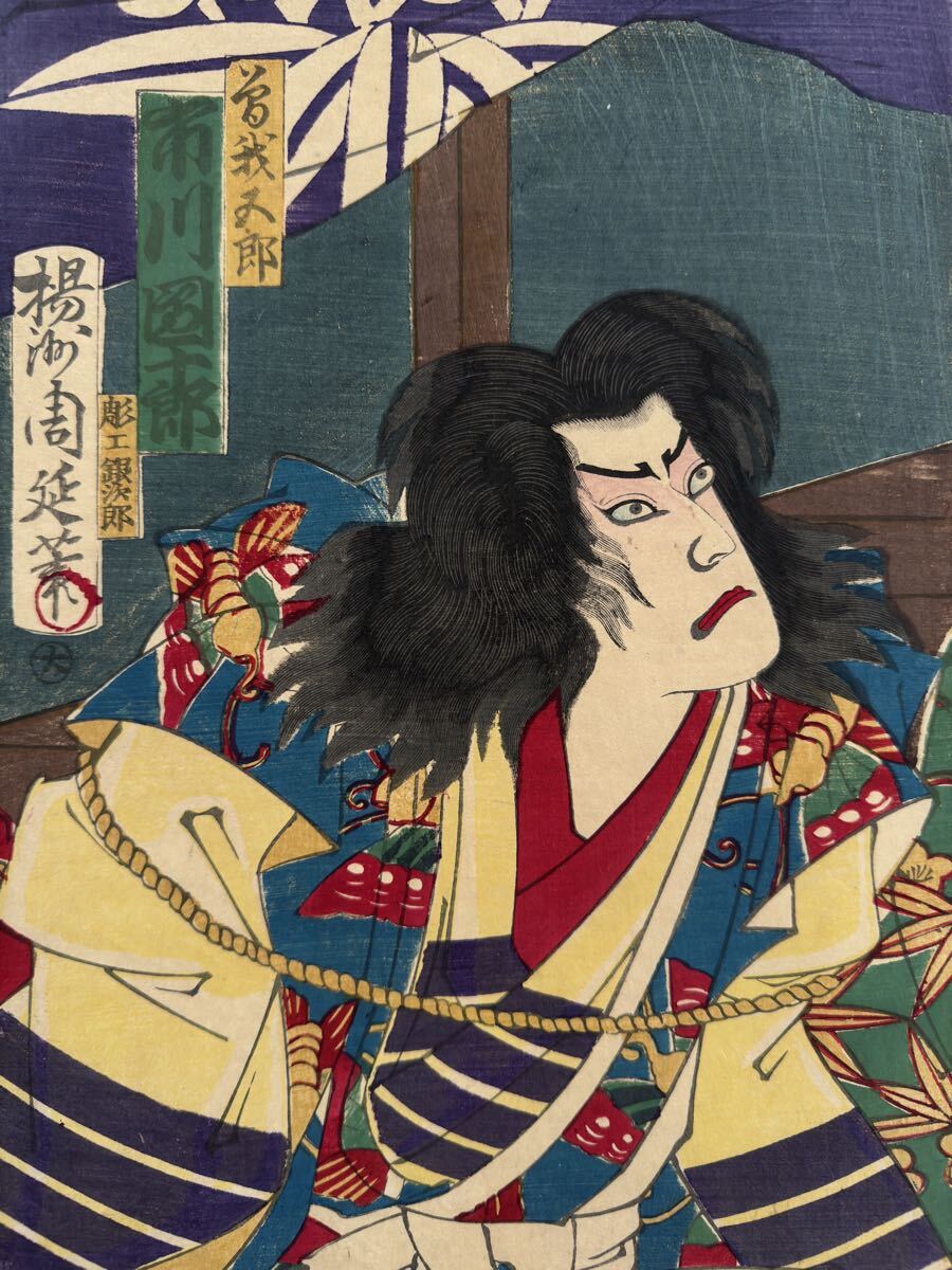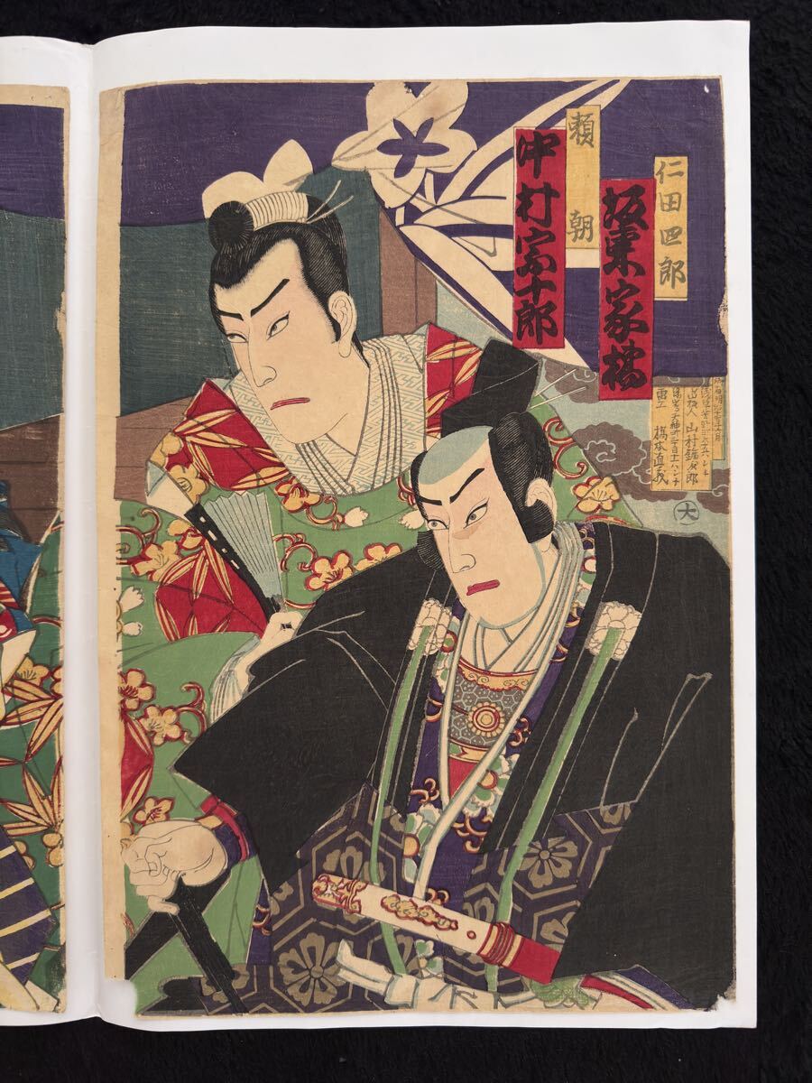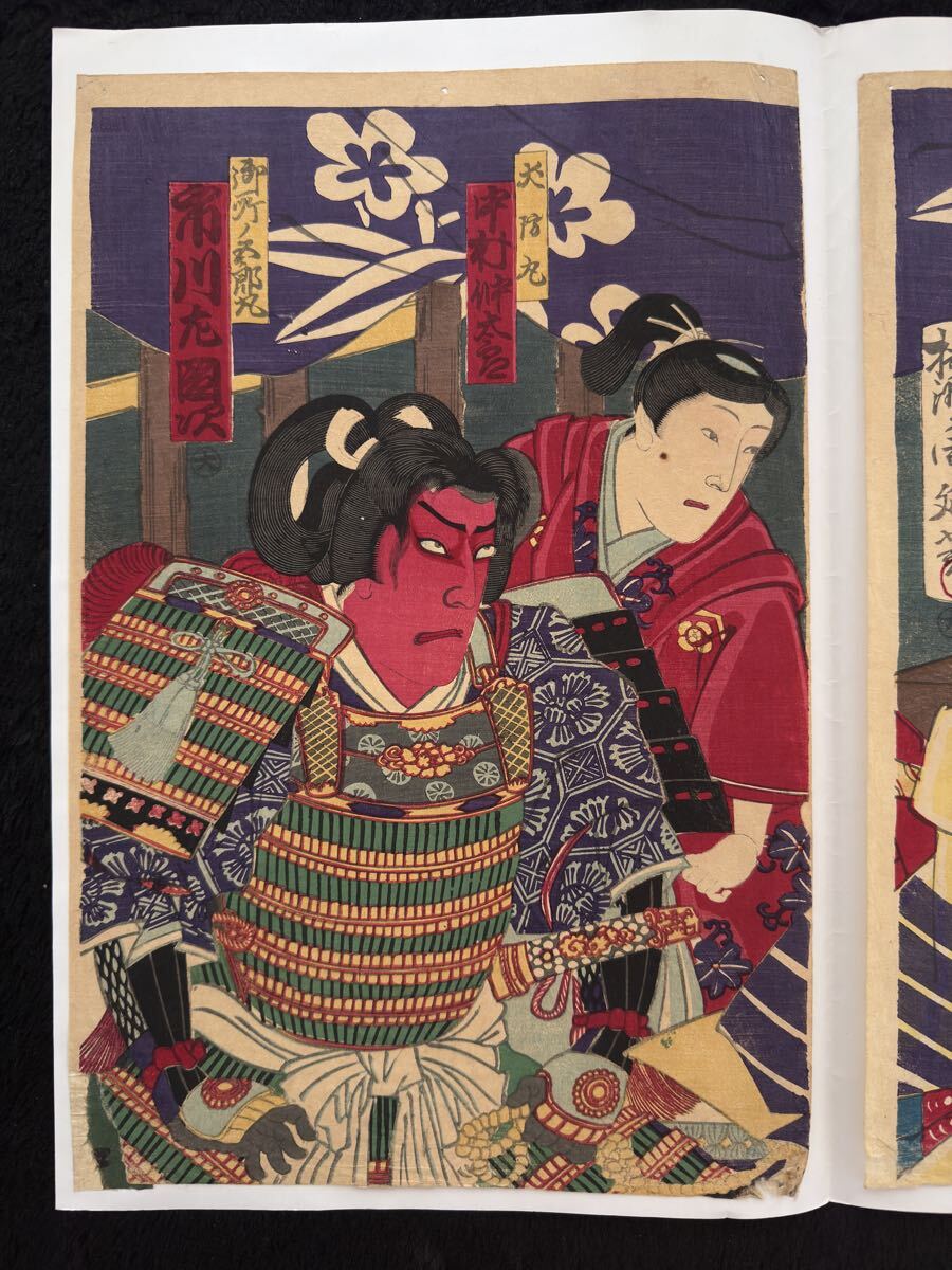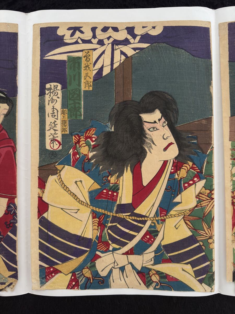 明治期/真作 楊洲周延「蝶千鳥曽我実伝」本物浮世絵木版画 役者絵 歌舞伎絵 芝居絵 錦絵 大判 三枚続き 台紙付き