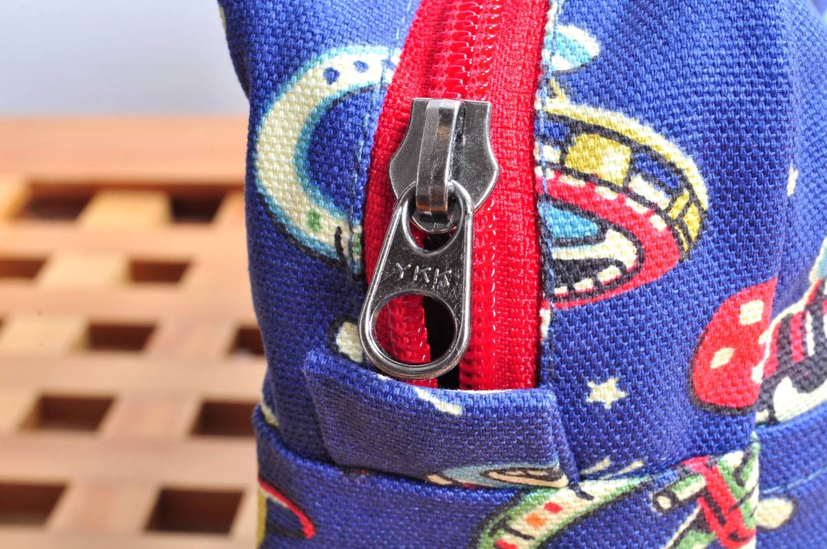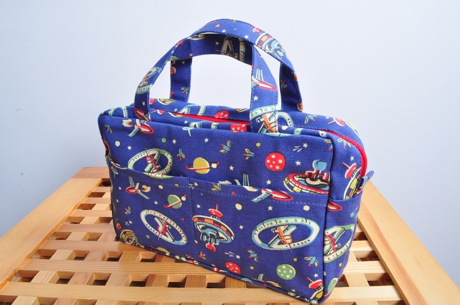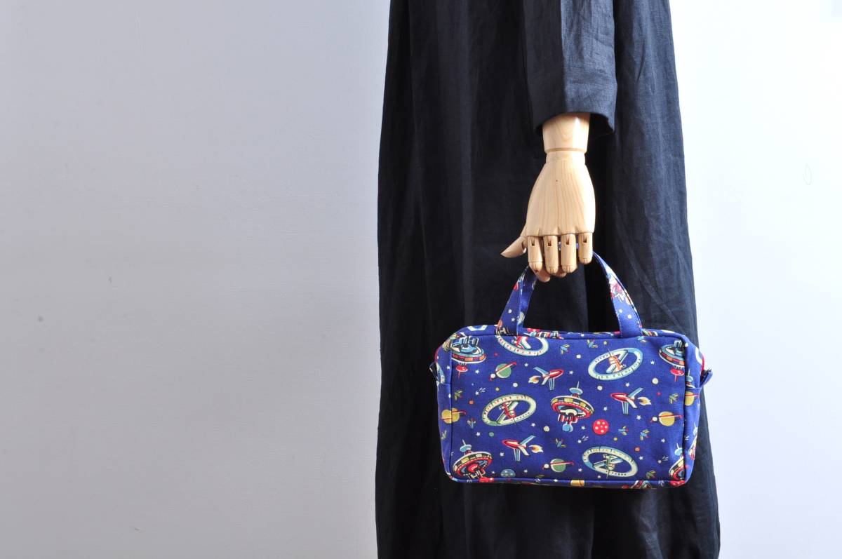 Space の厚手生地(オイルクロスではありません)を外側に、キャスドット柄のコットン生地を内側にあしらって、作りました。オイルクロスではありませんので軽く独特の温かみをお楽しみください。もっと作って欲しい~というお声にお答えして再度作りました♪今回は写真でも分かっていただけるかと思いますが、外側にもポケットを付けていますので、デスクの上に置いて、ペンたてやアイフォン入れにも♪