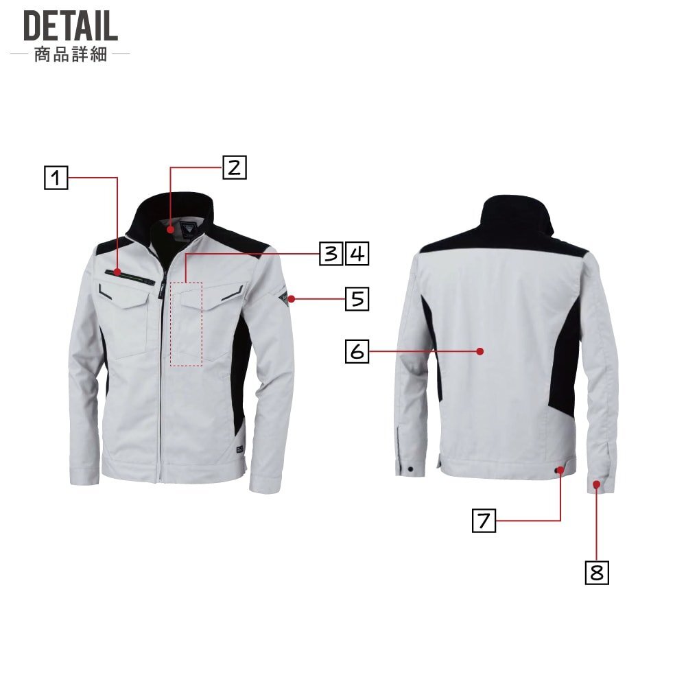 仕様:帯電防止/ストレッチ/ペン差し/両胸フラップポケット/左胸タテ型ポケット/背当てメッシュ付き/反射材つき/エコ素材/男女ペアシリーズ