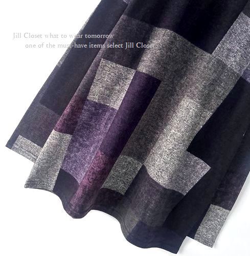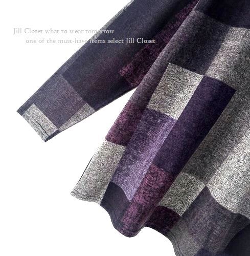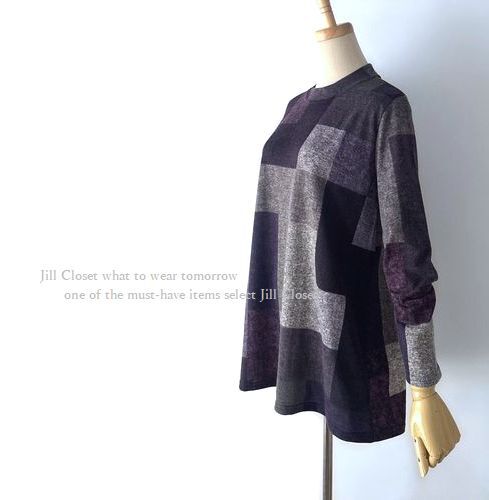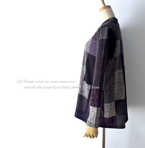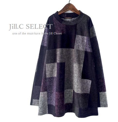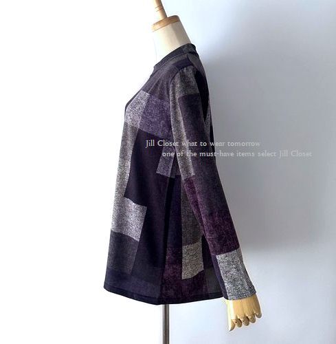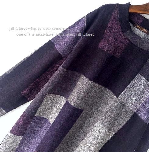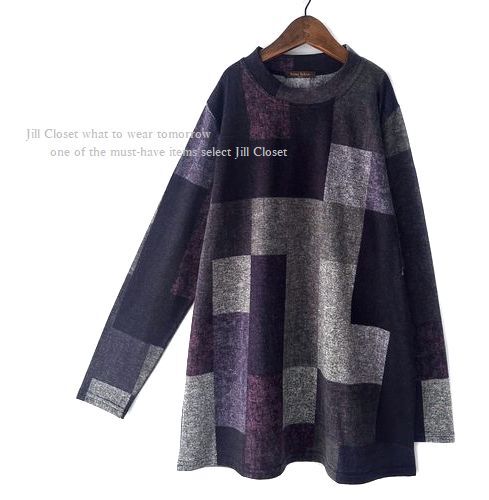 新品【送料185円】伸縮◎配色ブロックチェック柄*ニットソーストレッチ素材*プルオーバー*チュニック7716.purple