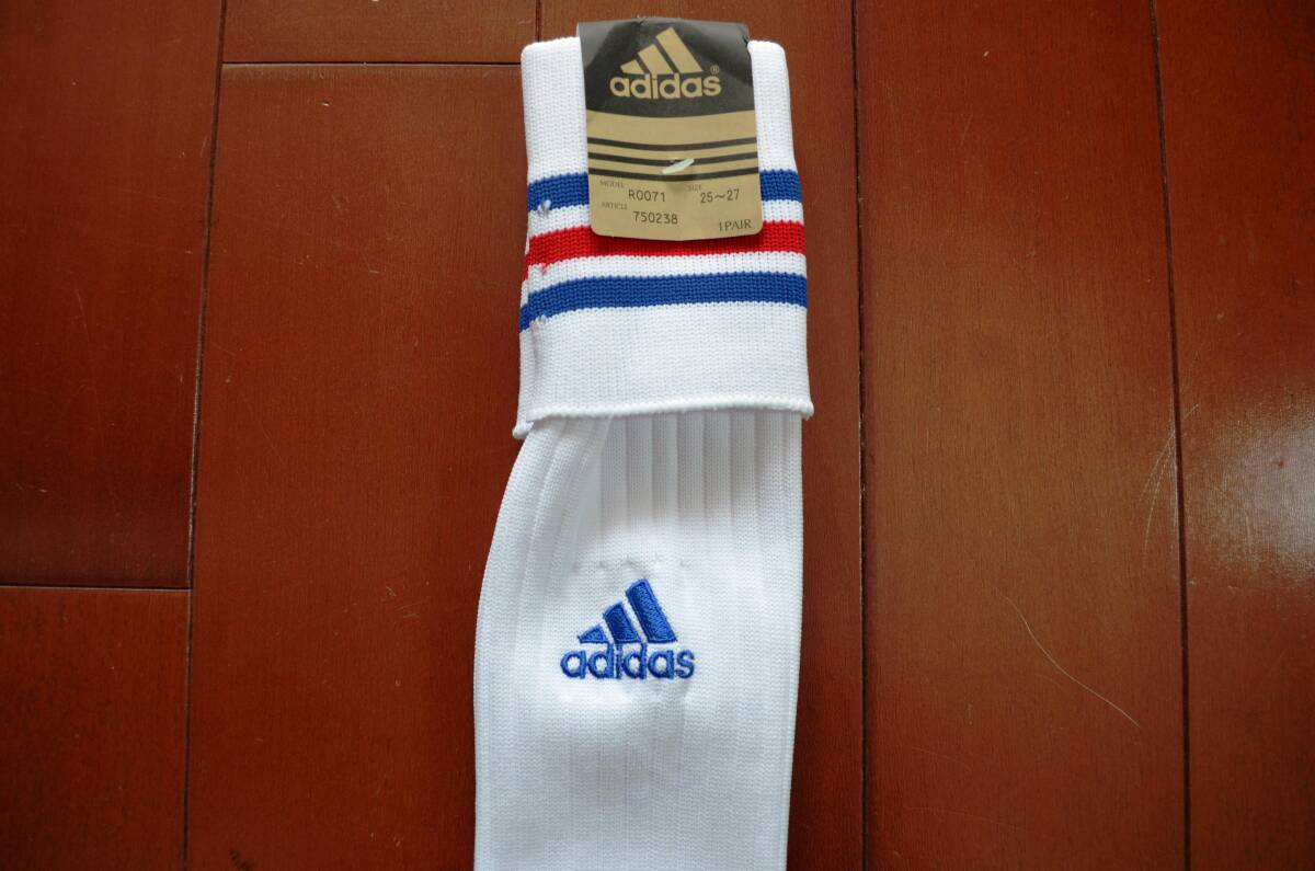 【iru-S6-K】超美品! 現品限り 新品未使用 デッドストック adidas アディダス サッカー ソックス 白地 青2x赤1本ライン 25-27