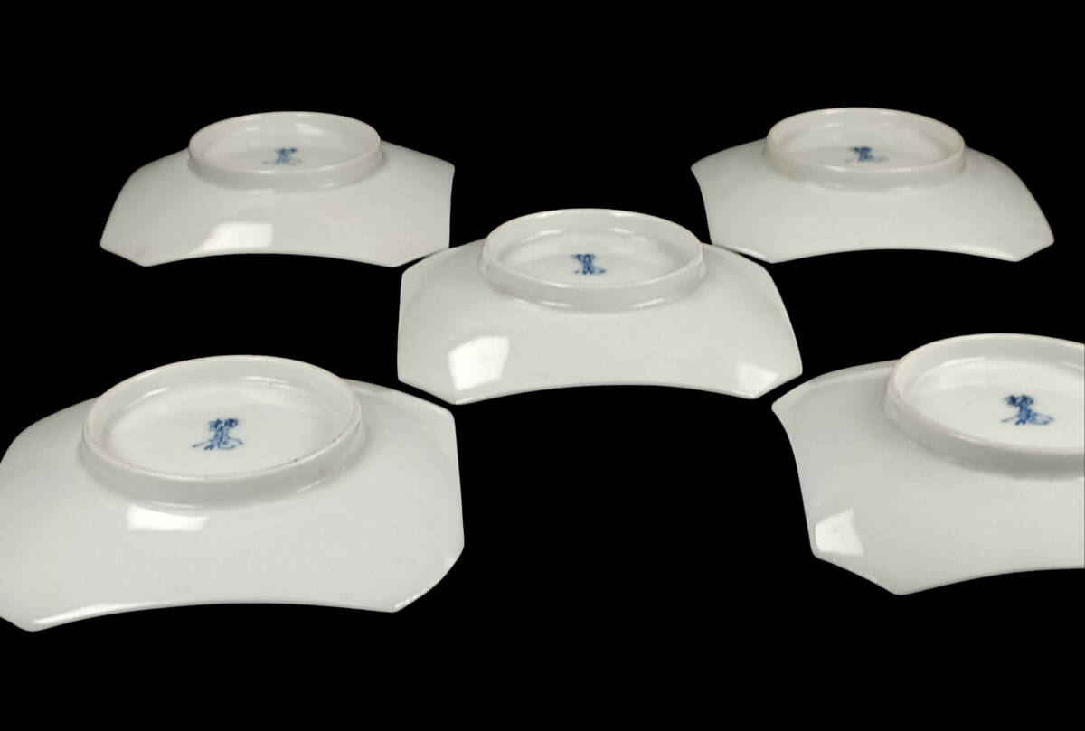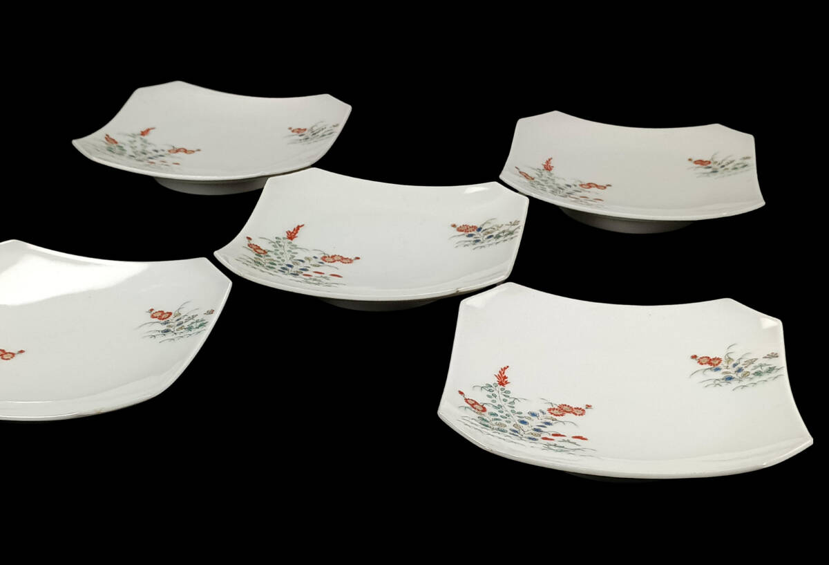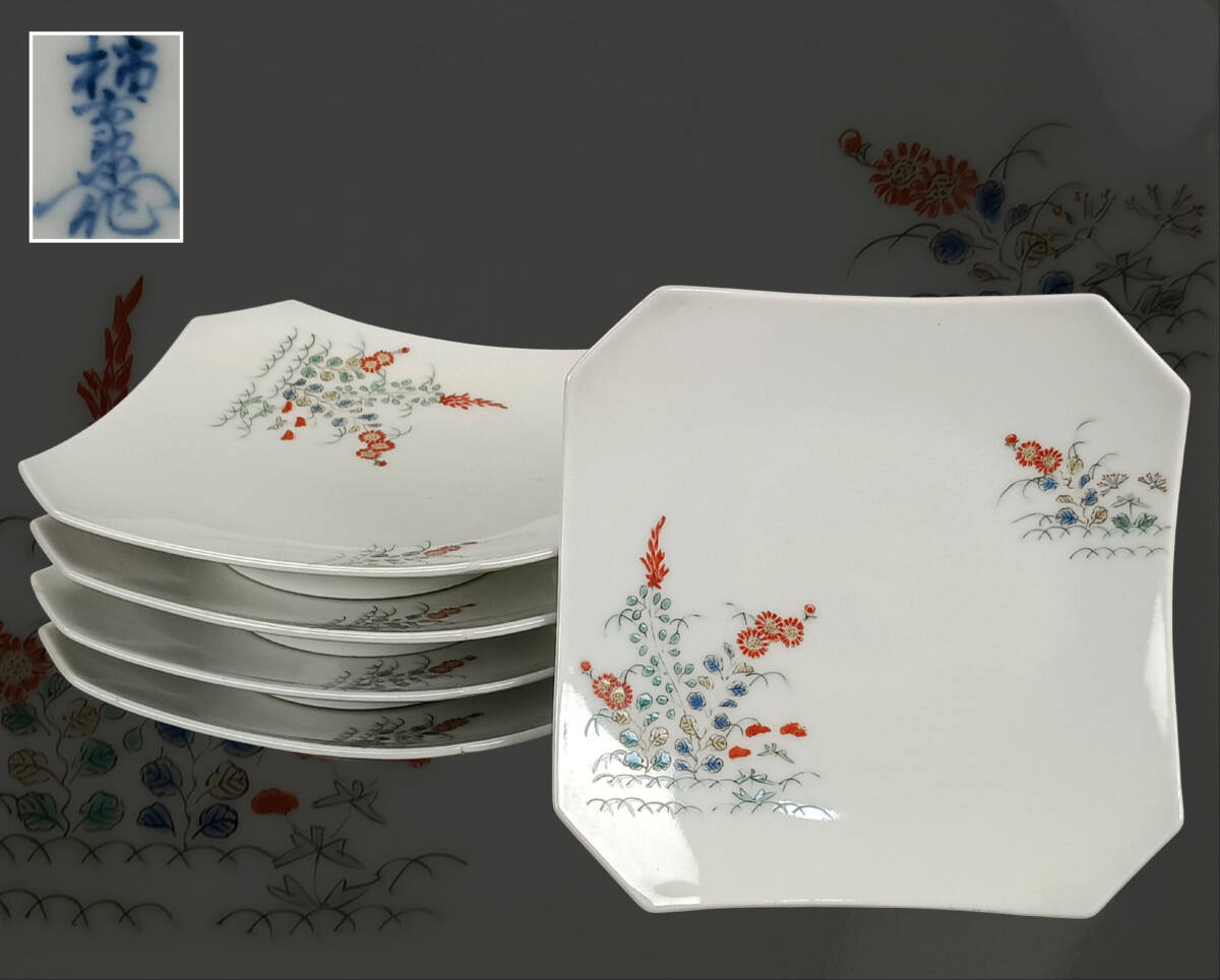 【偲】十二代 柿右衛門 伊万里 菓子皿 四季草花図 色絵皿 5客 陶磁器 銘々皿 茶道具 煎茶 茶器 染付 直径約11.5㌢ 皿 j-287