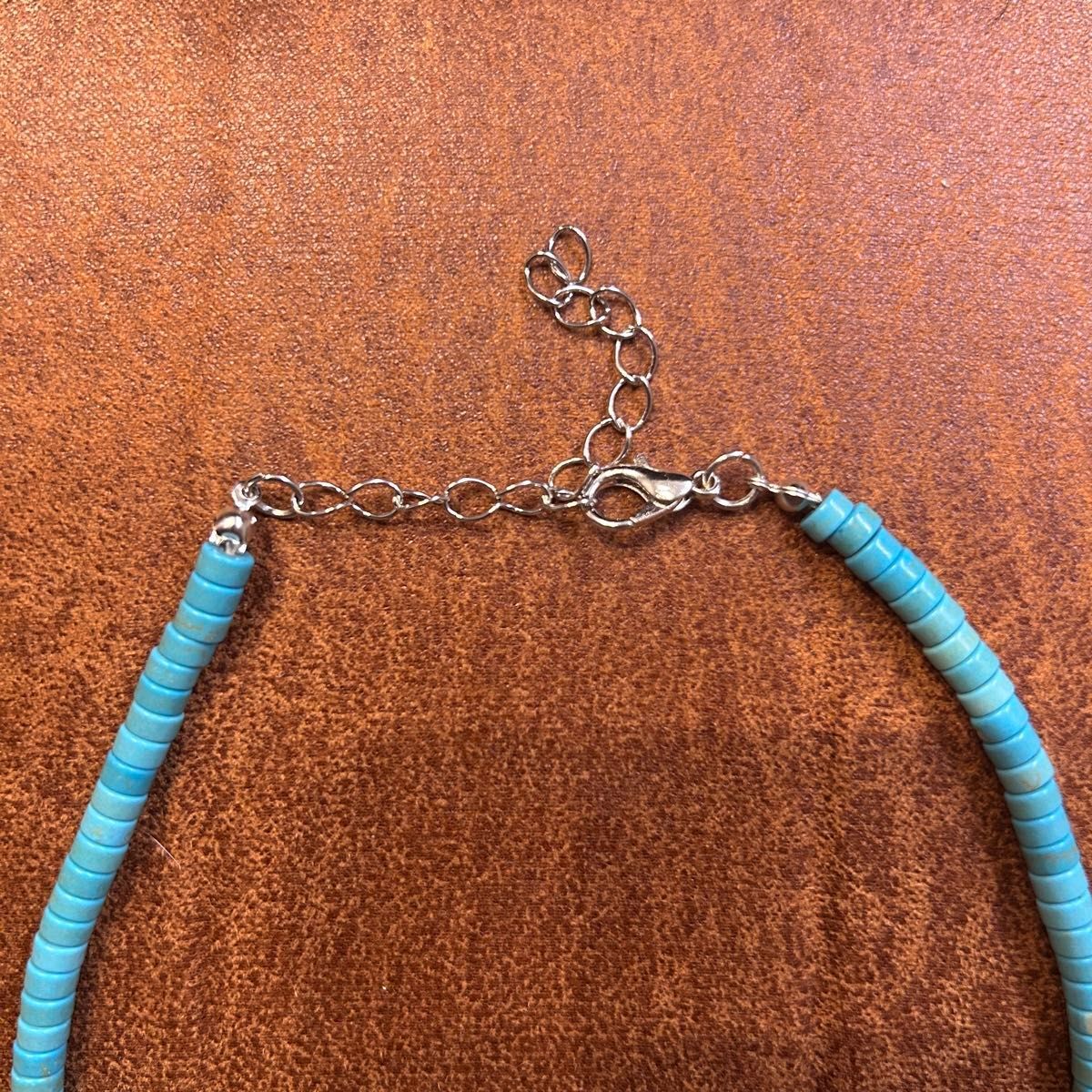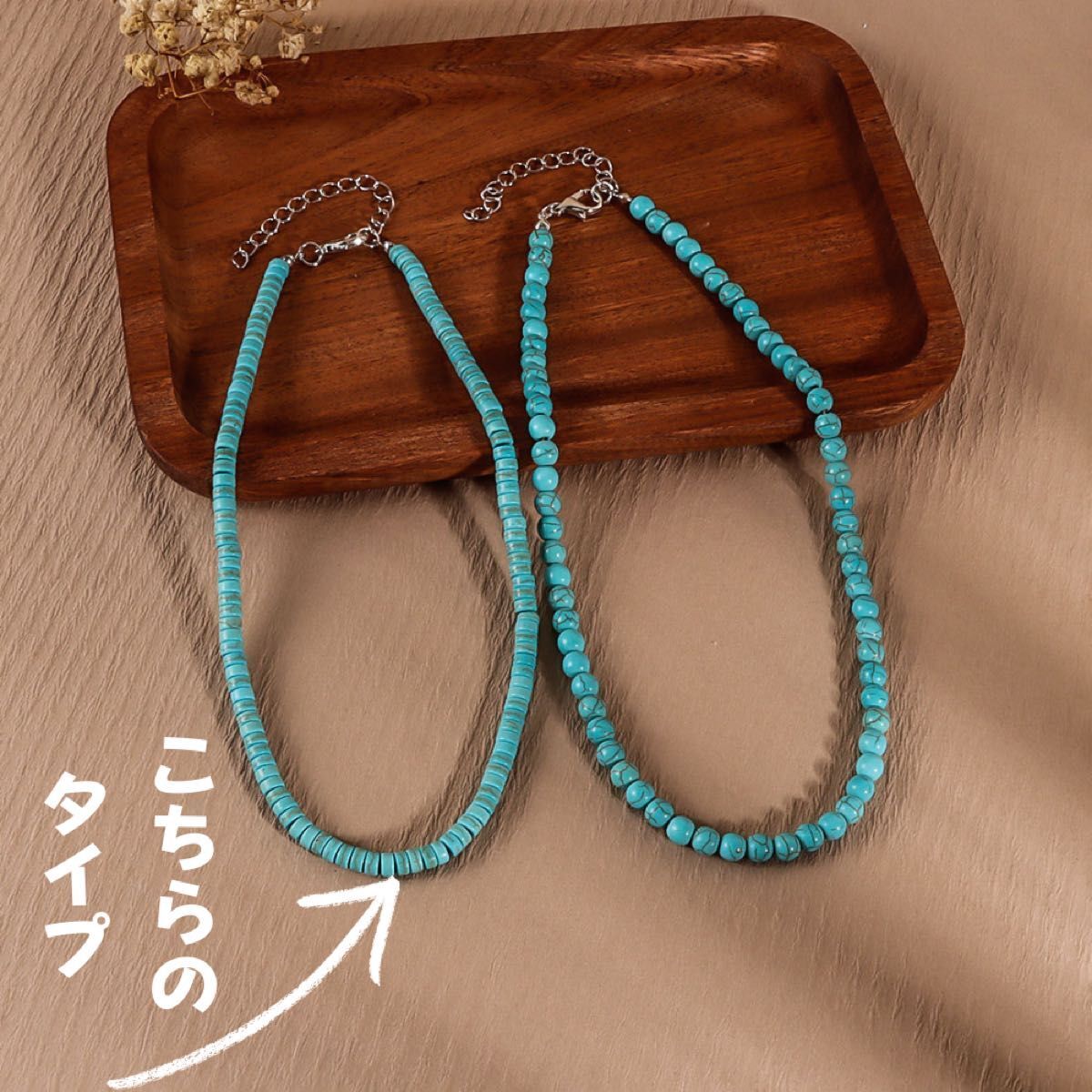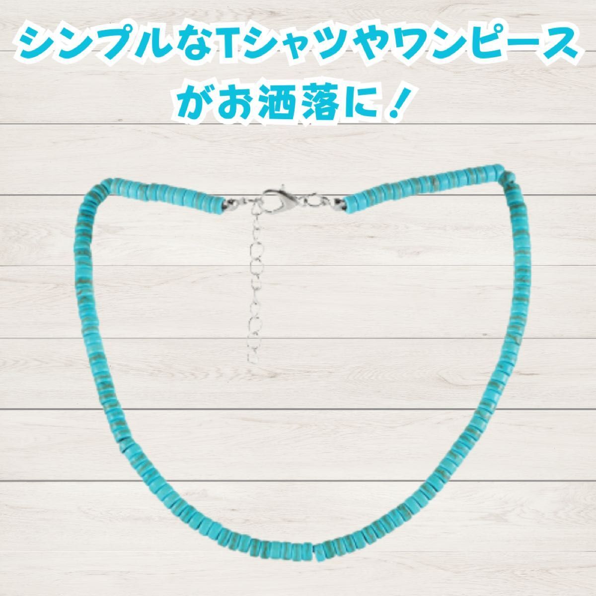 鮮やかなブルーのターコイズが、首元を華やかに演出。