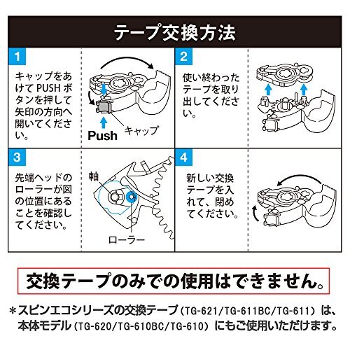 説明 ★特長★ ・素早くスムーズに美しく貼れる、テープのり! 長3封筒が約220枚も貼れる、かわいいプロ仕様。(1つの封筒10cm使用の場合) ・「スピンヘッド」機構で詰替え簡単! ケースの開閉にヘッドが連動して回転、中身を引き出して載せるだけのワンタッチ交換式です。 ・テープ長たっぷり22mで経済的! 薄膜の剥離素材フィルムを使用することで、長いテープがコンパクトサイズに。 ・廃棄量カットでエコロジー。 ローラーやキャップを本体に残す省廃棄設計で、捨てる部分を大幅に減らしました。 ・写真の変色を防ぐフォトセーフ(アシッドフリー) ※スピンエコハニカム交換テープは、スピンエコシリーズのすべてに互換性があります。 交換テープ(TG-621/TG-611BC/TG-611)は、本体モデル(TG-620/TG-610BC/TG-610)にもご使用いただけます。 ※本製品のみでの使用はできません。本体(別売)と一緒にご利用下さい。 ※カラーコピーなど、オイルの付着した紙等への使用は、のりが付きにくい為適しません。 ※室温15℃~35℃の範囲でご使用下さい。