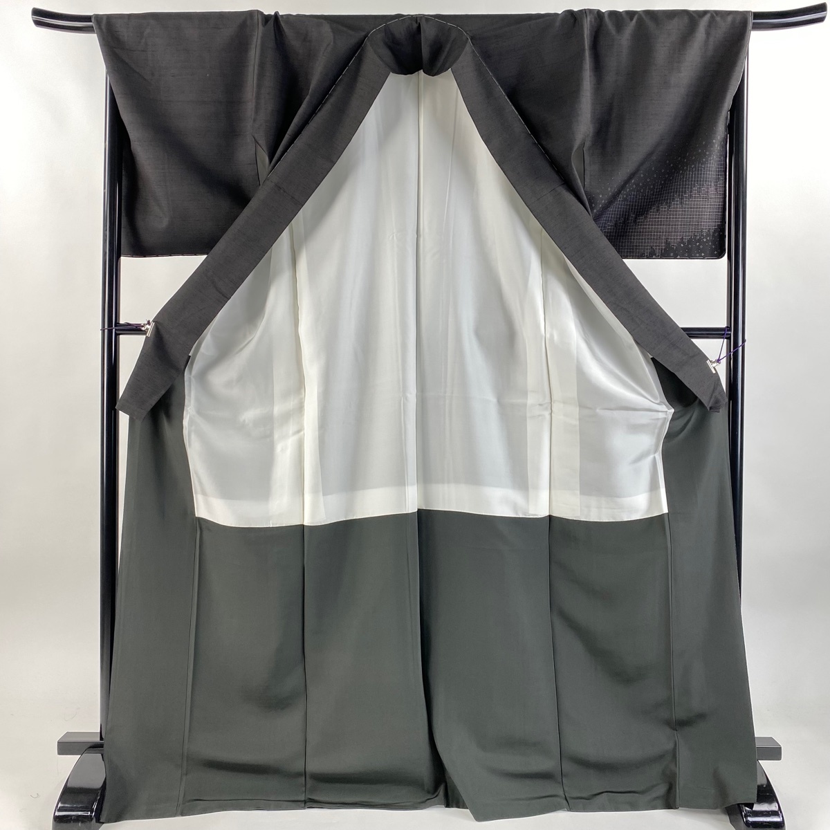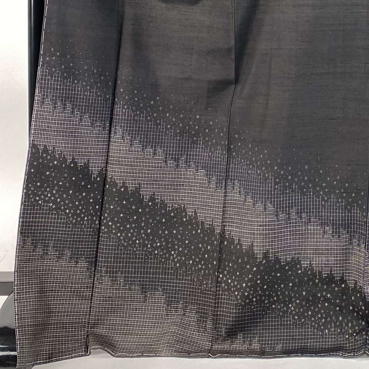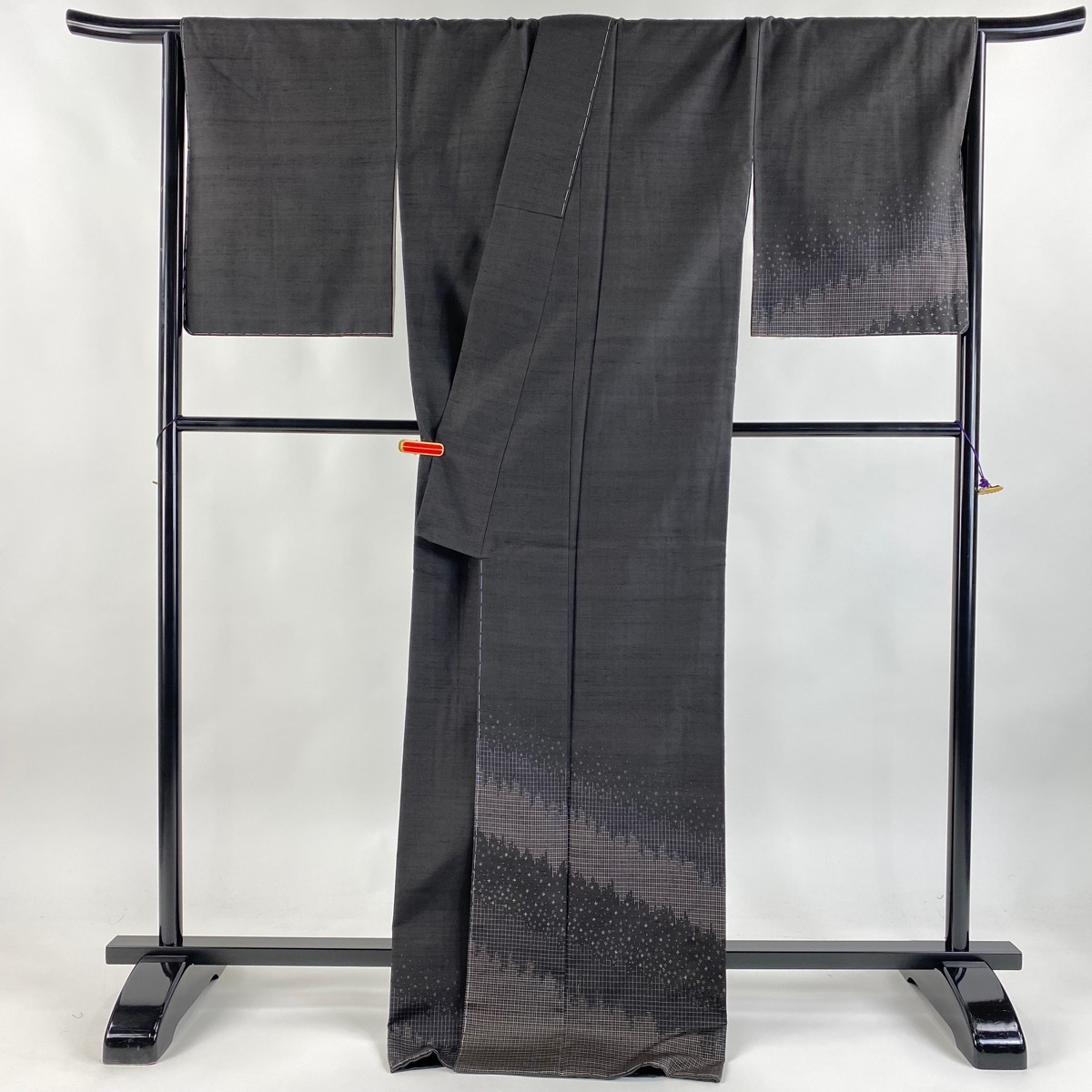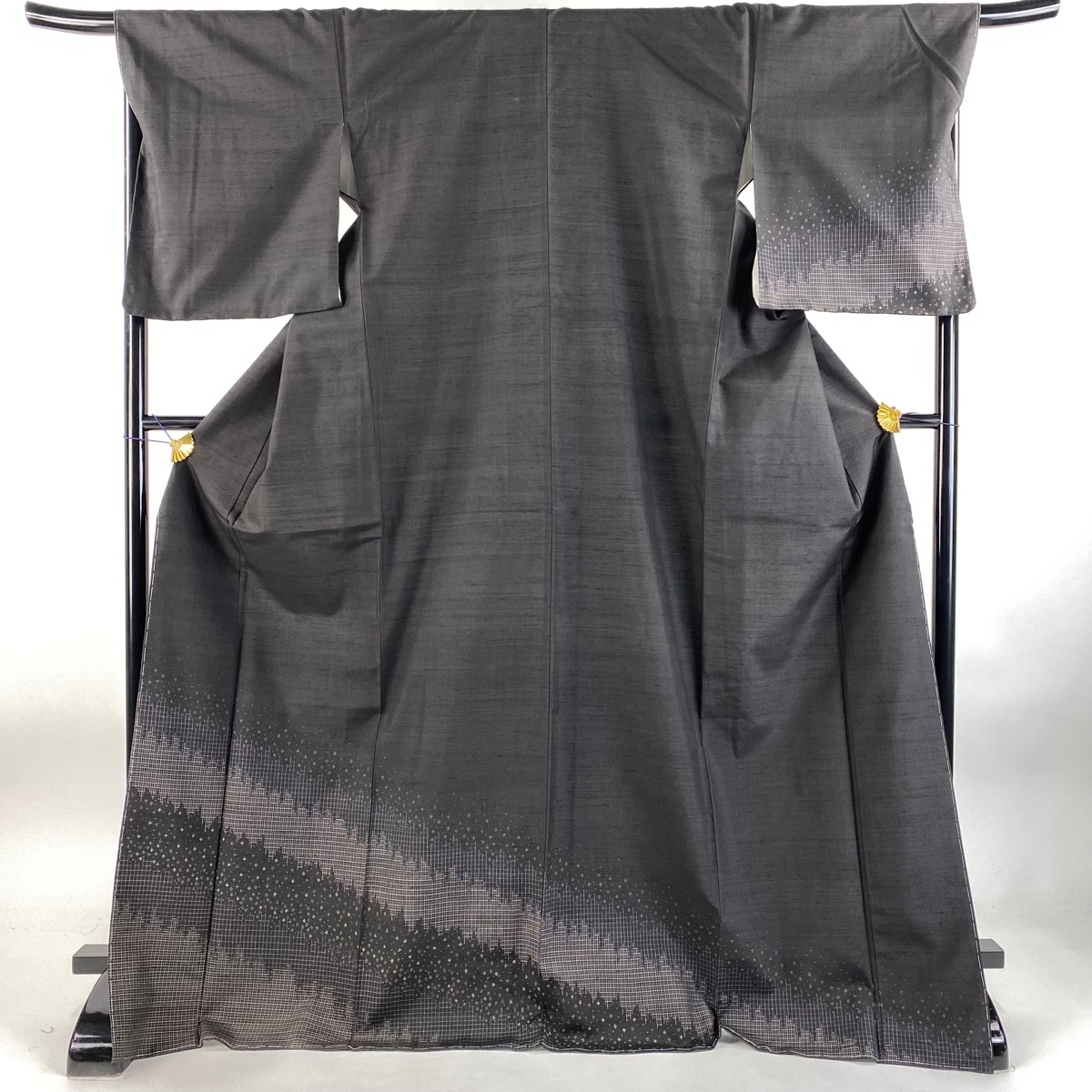 | 付下げ 美品 逸品 落款 証紙 赤城紬 草木染工房 幾何学 格子 墨色 袷 身丈173 裄丈68.5 L 正絹 【中古】 |