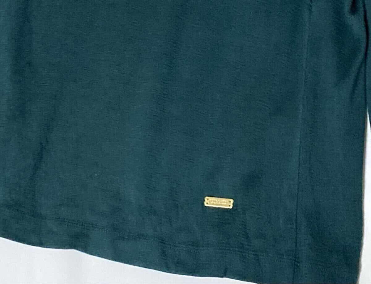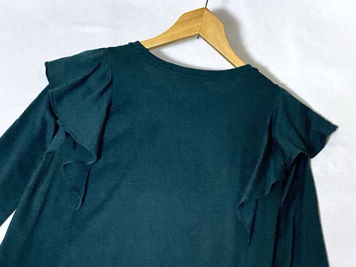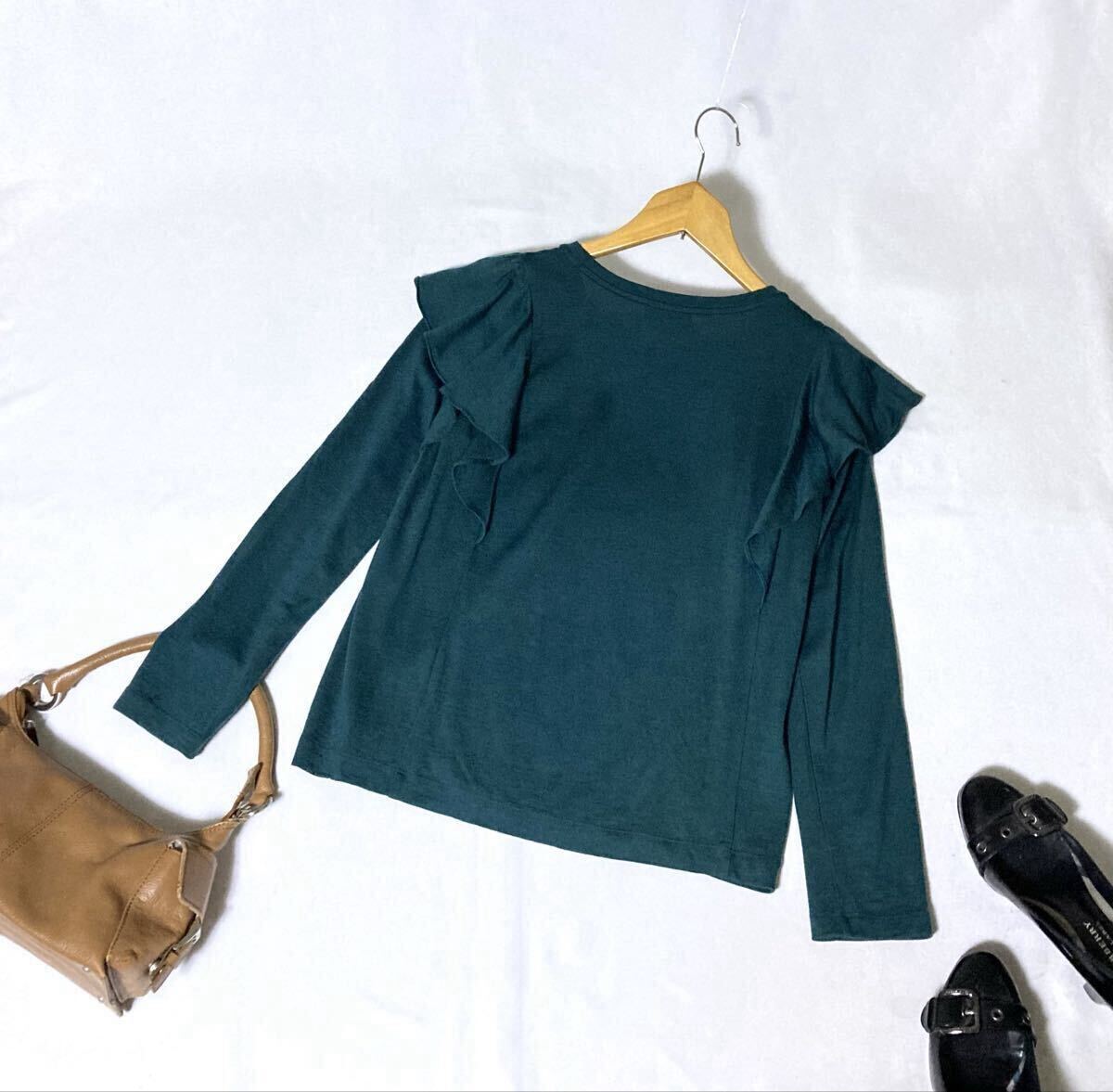 肩のフリルが可愛いラウンドネックのニットです。カットソーの様な薄手のニットです。裾にブランド刻印入りのプレートが付いています。