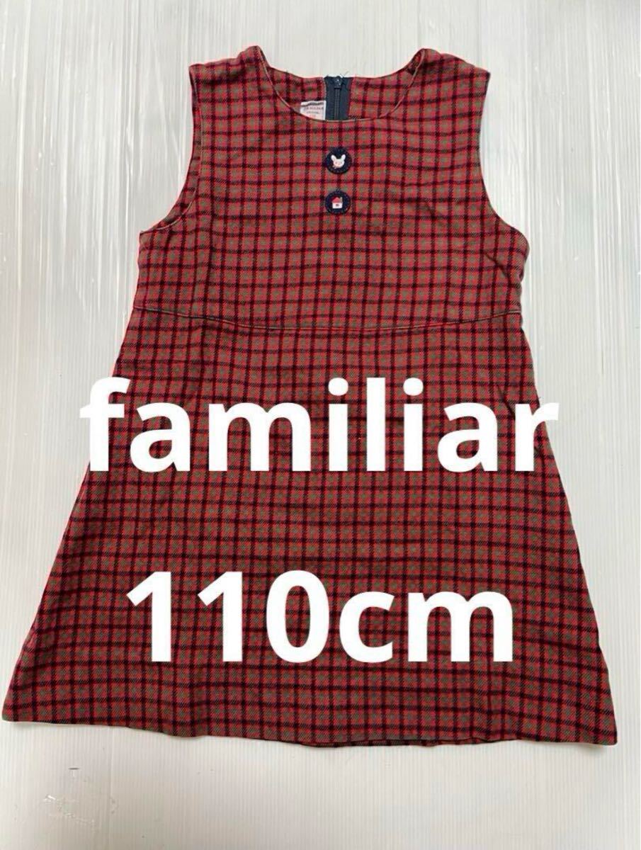 可愛いウサギと家の手縫い刺繍アップリケが特徴的な110cmサイズの赤チェック柄、ファミリア Familiar のノースリーブジャンバースカートです。