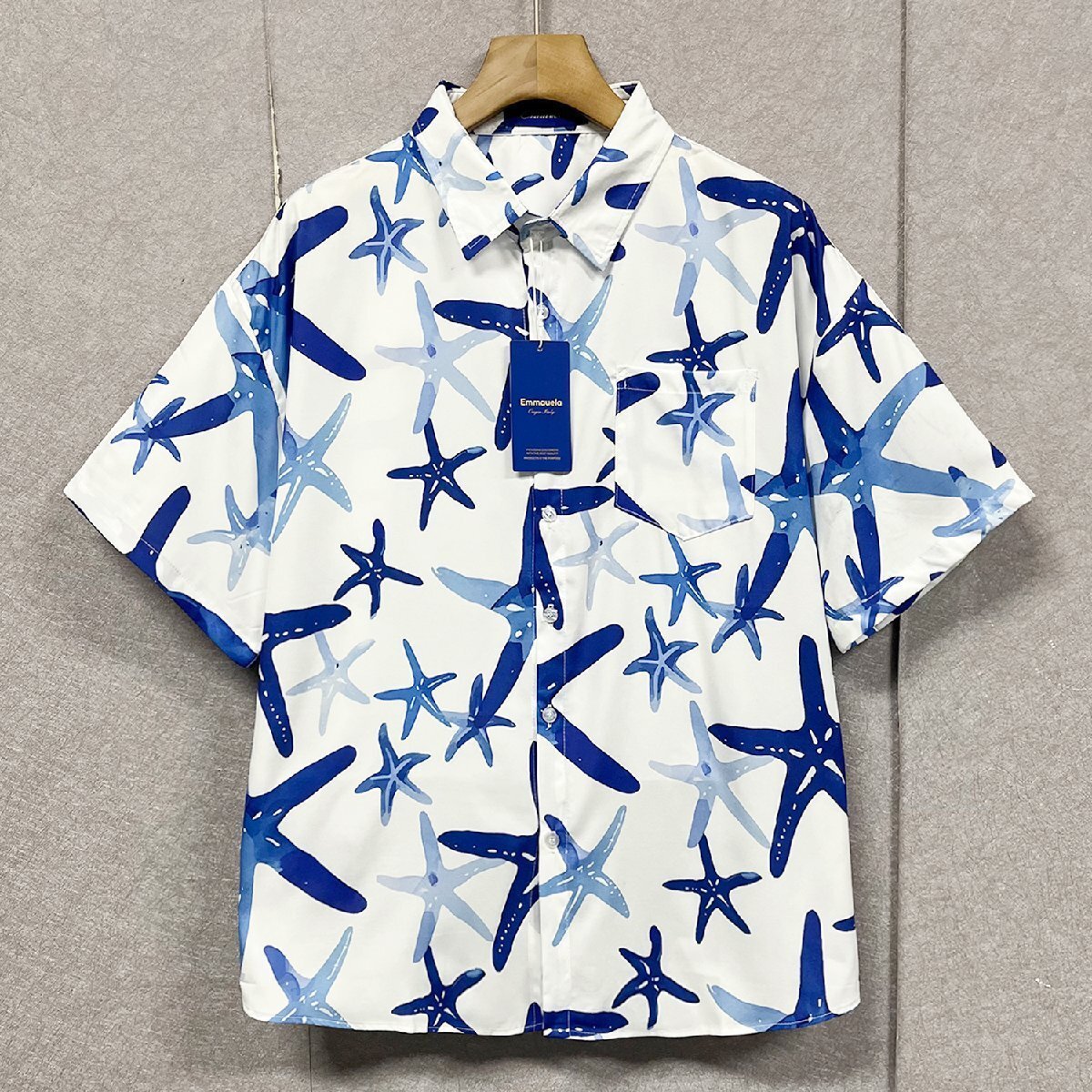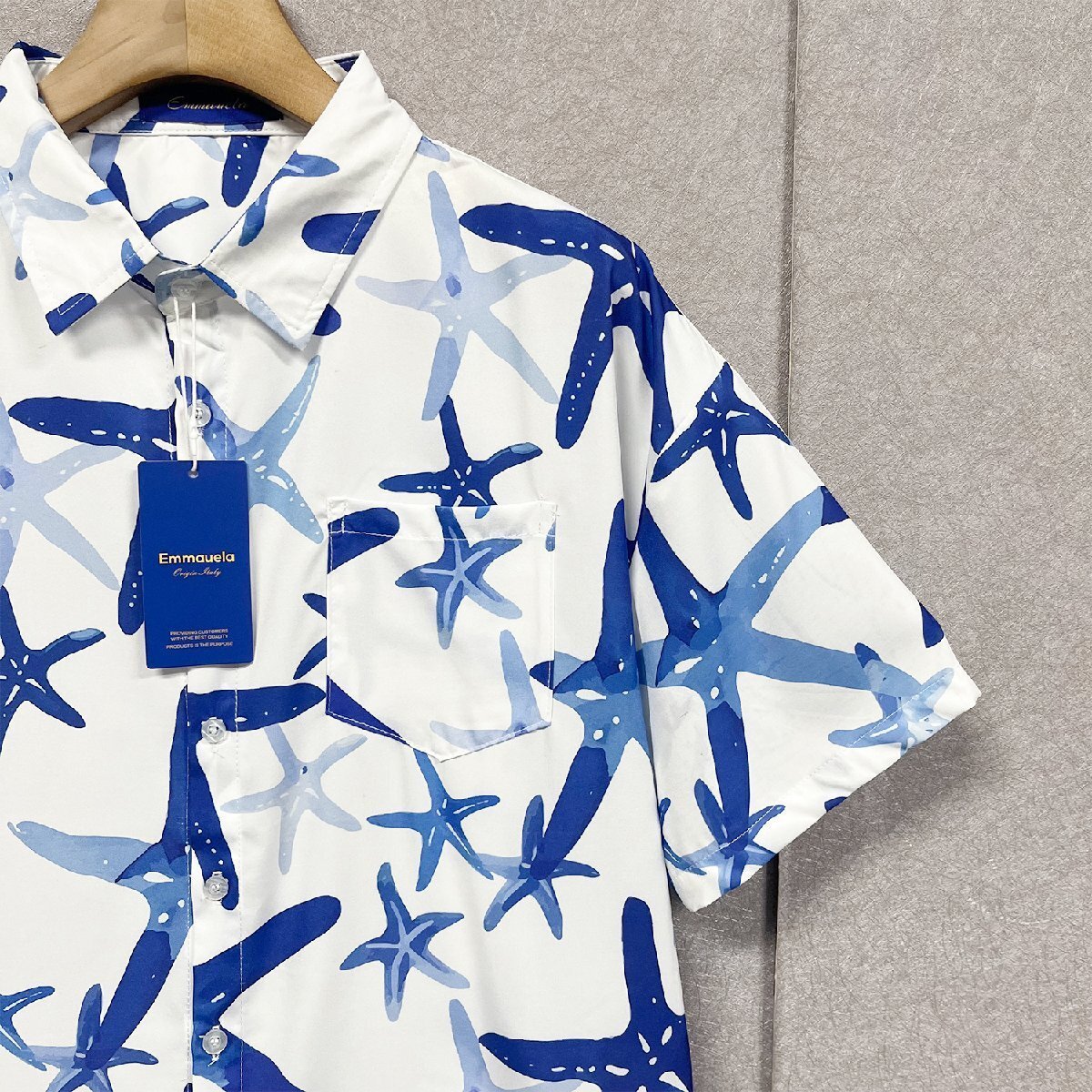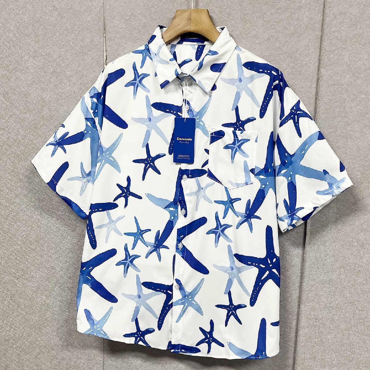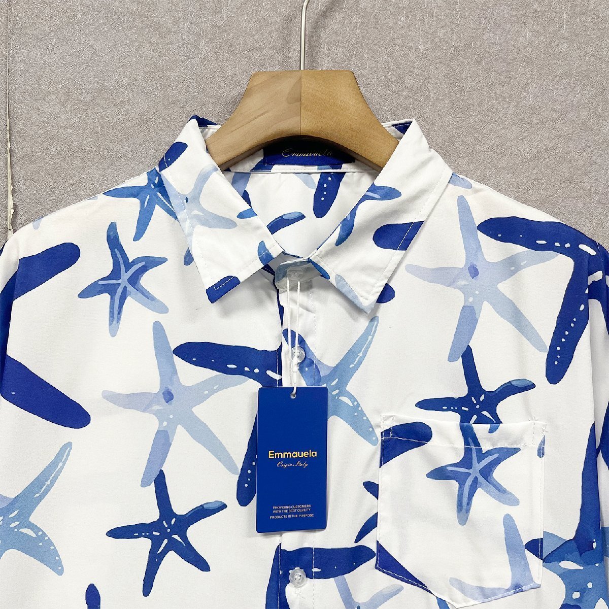 個性・アロハシャツ 定価2万◆Emmauela・イタリア・ミラノ発◆シルク混 速乾 清涼感 ヒトデ柄 総柄 カジュアル ハワイアン 海辺 ビーチ M/46サイズ