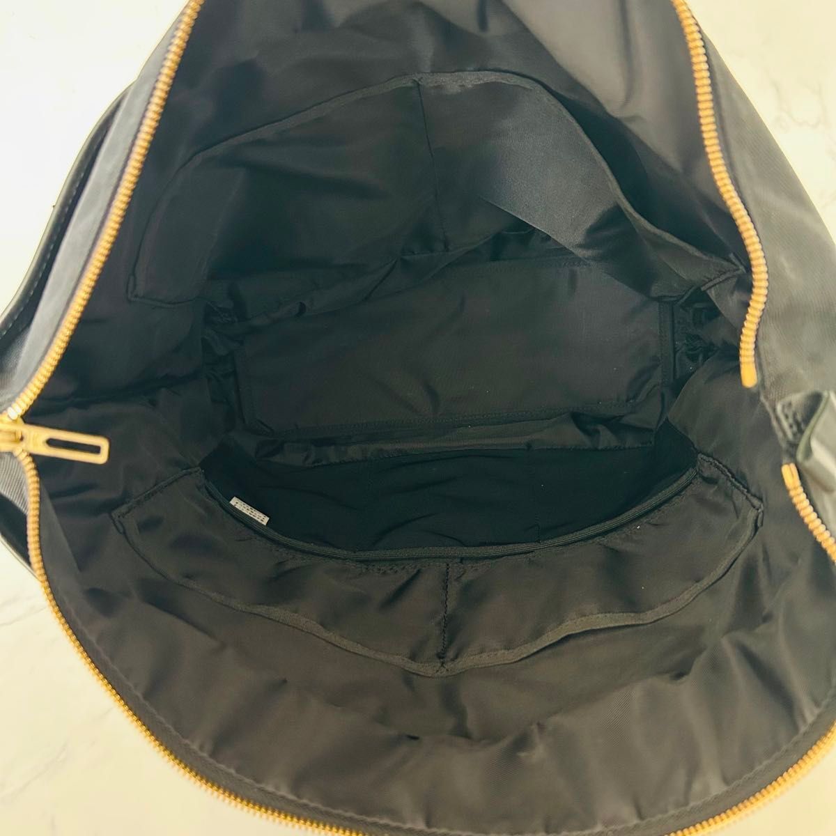 表生地はエアバッグなどにも用いられる1000デニールの6ナイロン強力スパン糸を平織りにした生地を採用。軽く耐久性に優れたナイロン地で、パイピングなどレザーのポイント使いが大人っぽいアイテム。内側にはポケットが充実しており、長くご愛用いただけます。