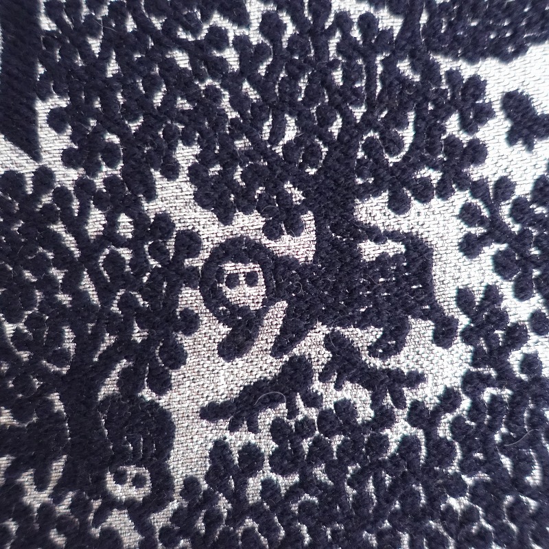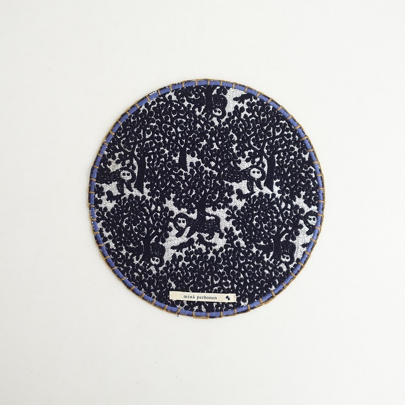 mina perhonenのmoon bear ファブリックマットです。カラーは、ダークネイビーとシルバーで、moon bearのテキスタイルがあしらわれている、まん丸なマットです。回りにはパープルで刺しゅうが施され、ベージュの糸でステッチがされております。 |