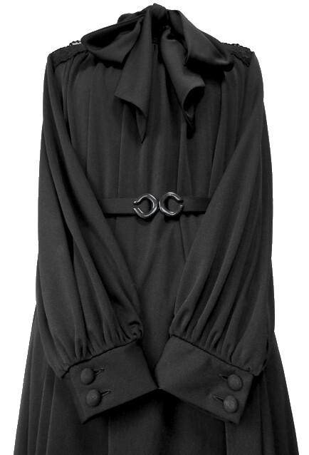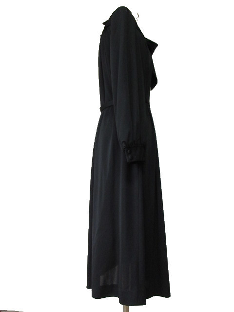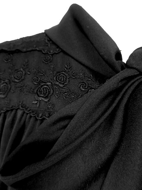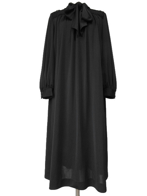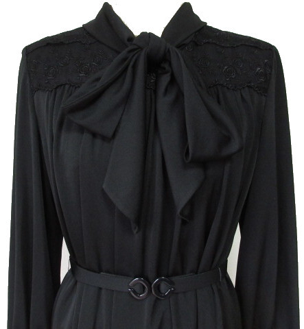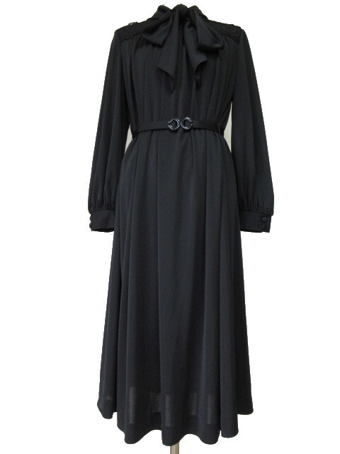 古着♪レトロ・Vintage黒無地レースボウタイワンピ♪衣装式長袖秋冬日本製70s60s70年代60年代80年代13号即決ヴィンテージアンティーク昭和